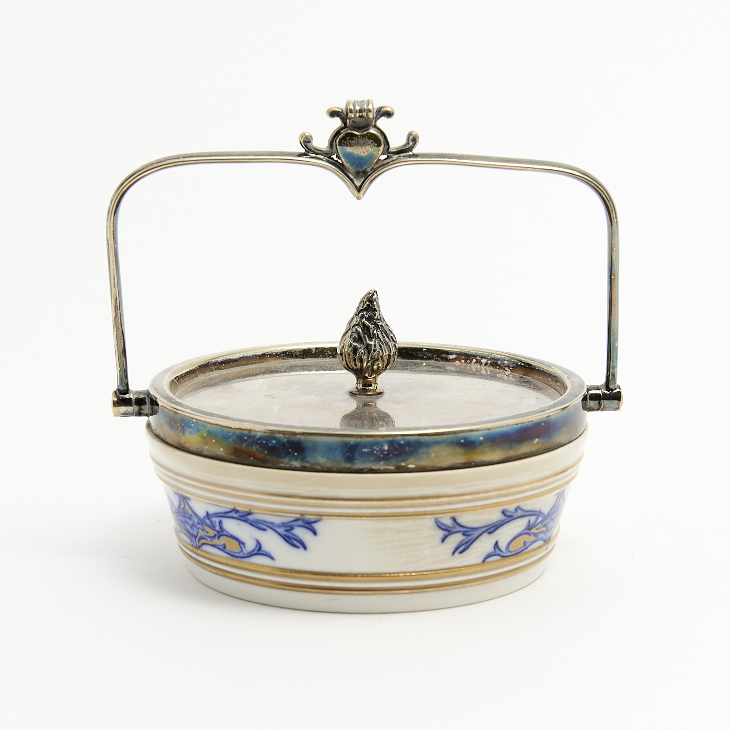 A BURSLEM PORCELAIN STERLING SILVER SWING HANDLE LIDDED BASKET DIA.13CM, LEONARD JOEL DELIVERY SIZE: SMALL