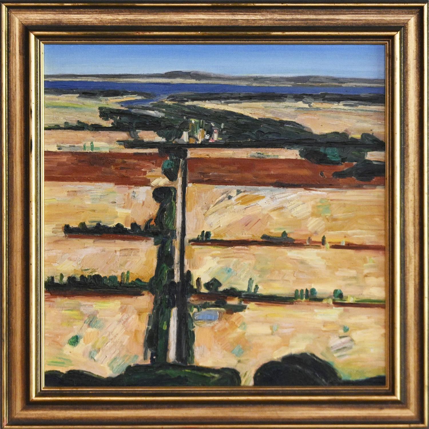 JEFFREY MAKIN, CORIO BAY FROM THE YOU YANGS 1975, OIL ON LINEN, SIGNED LOWER RIGHT, TITLED VERSO, 59 X 59CM, FRAME SIZE: 75 X 75CM