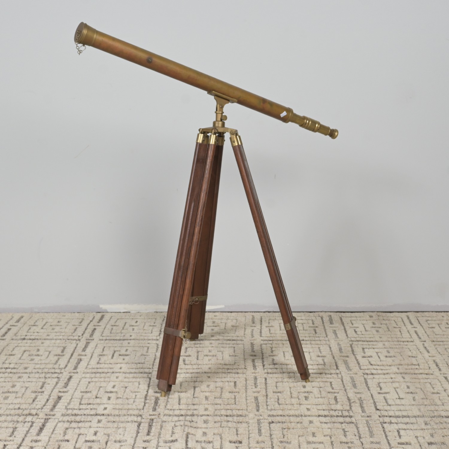 A VINTAGE SOLID BRASS EXTENDABLE TRIPOD MOUNTED TELESCOPE (114H X 100W CM) (LEONARD JOEL DELIVERY: LARGE)