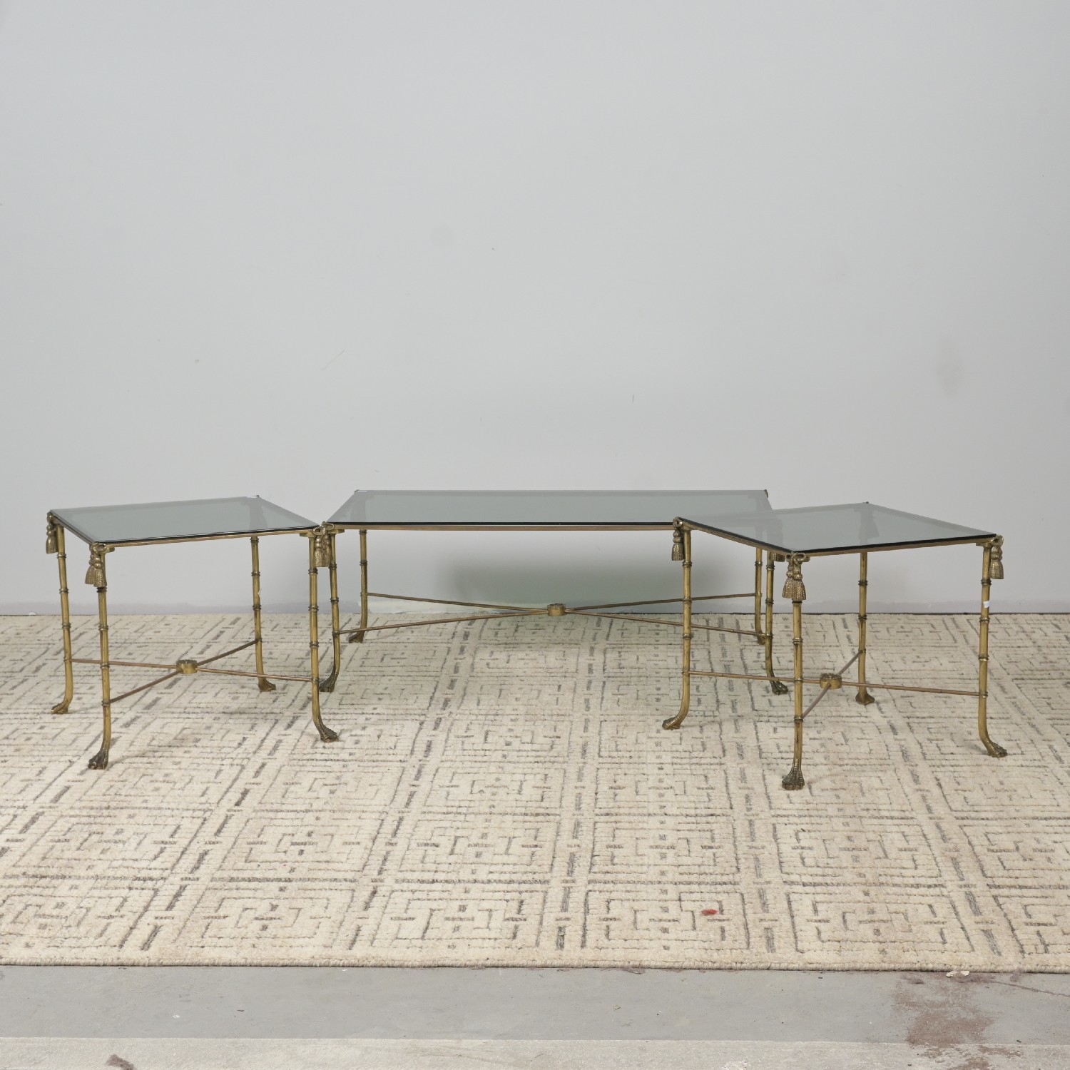 A SET OF THREE 1960s GLASS-TOPPED BRASS LOW TABLES – ONE RECTANGULAR AND A SQUARE PAIR (39H X 103W X 53D CM) (LEONARD JOEL DELIVERY: X-LARGE)