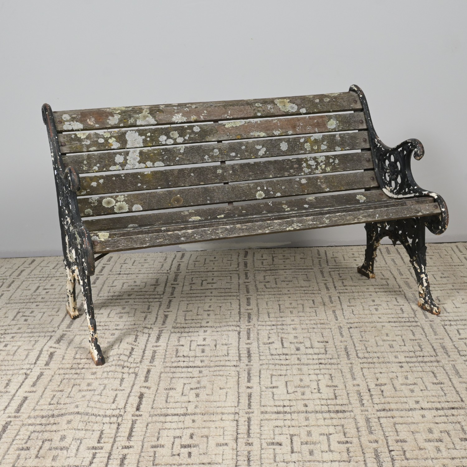 A VICTORIAN CAST-IRON ENDED WOODEN SPLATTERED GARDEN BENCH (A/F) (78H X 124W X 65D CM) (THIS HEAVY ITEM MUST BE REMOVED BY CARRIERS AT THE CUSTOMER'S EXPENSE. LEONARD JOEL STAFF CANNOT ASSIST CARRYING THIS ITEM)