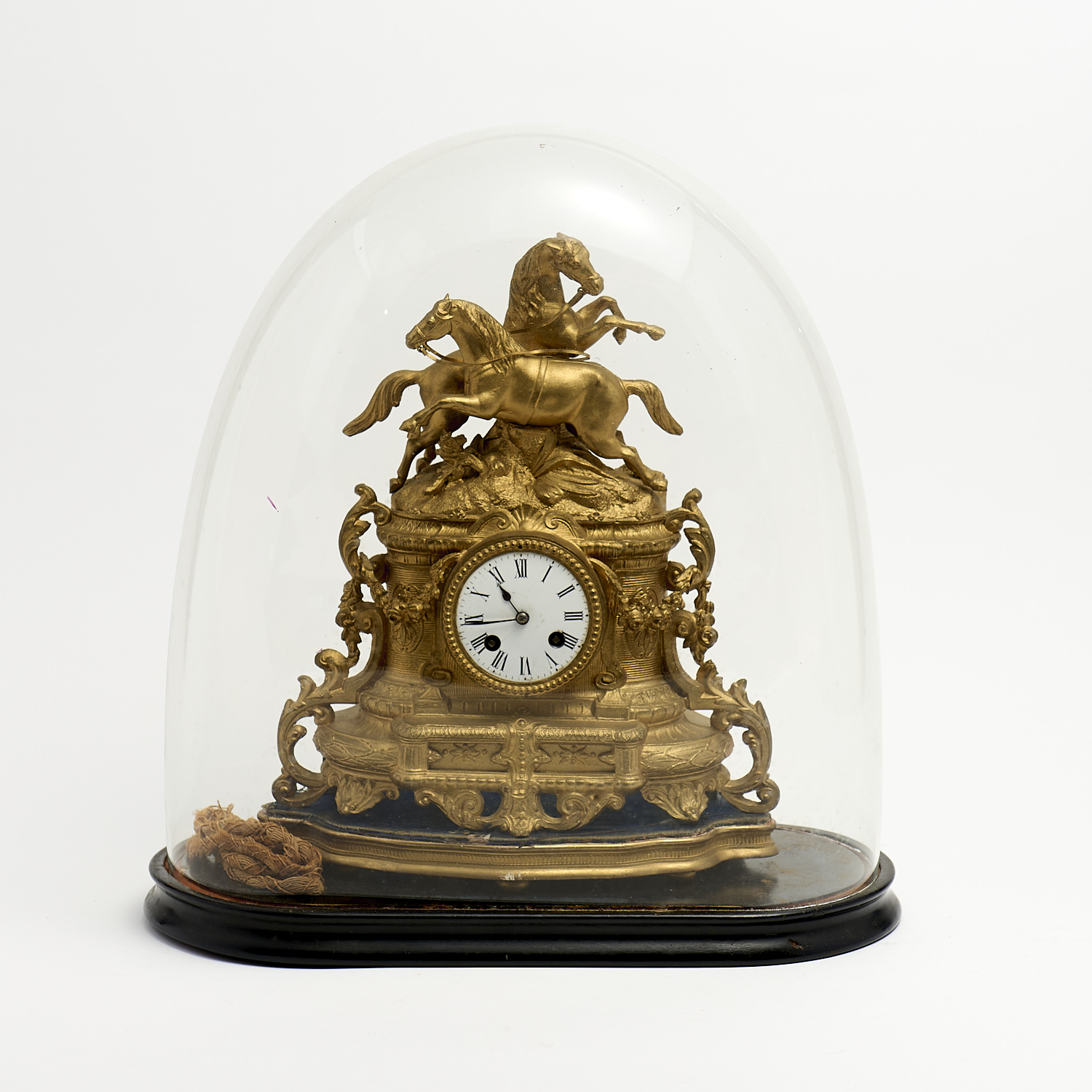 A FRENCH SPELTER MANTEL CLOCK STYLED WITH TWO HORSES, WITH DOME COVER (NO KEY, NO PENDULUM) H.41CM (CLOCK), LEONARD JOEL DELIVERY SIZE: LARGE