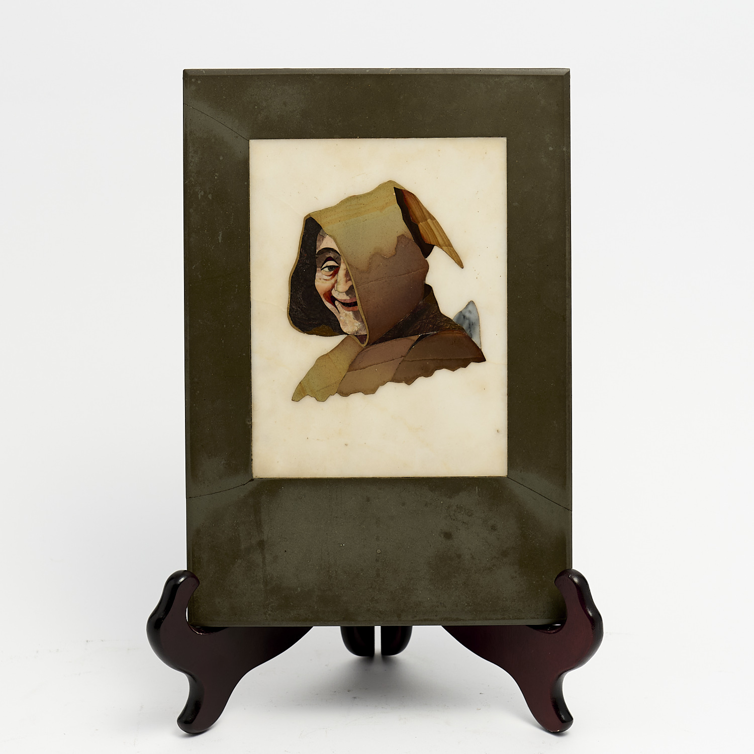 A PIETRA DURA PLAQUE OF A HOODED MAN (A/F) H.29CM (PLAQUE), LEONARD JOEL DELIVERY SIZE: SMALL