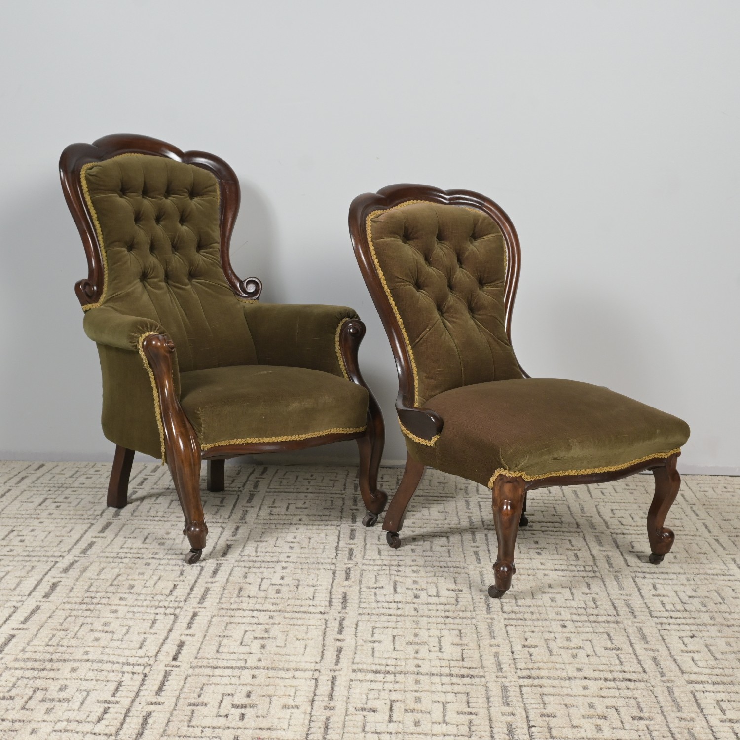 A VICTORIAN UPHOLSTERED ARMCHAIR AND MATCHING LADY'S CHAIR (A/F) (102H X 75W X 70D CM) (LEONARD JOEL DELIVERY: X-LARGE)