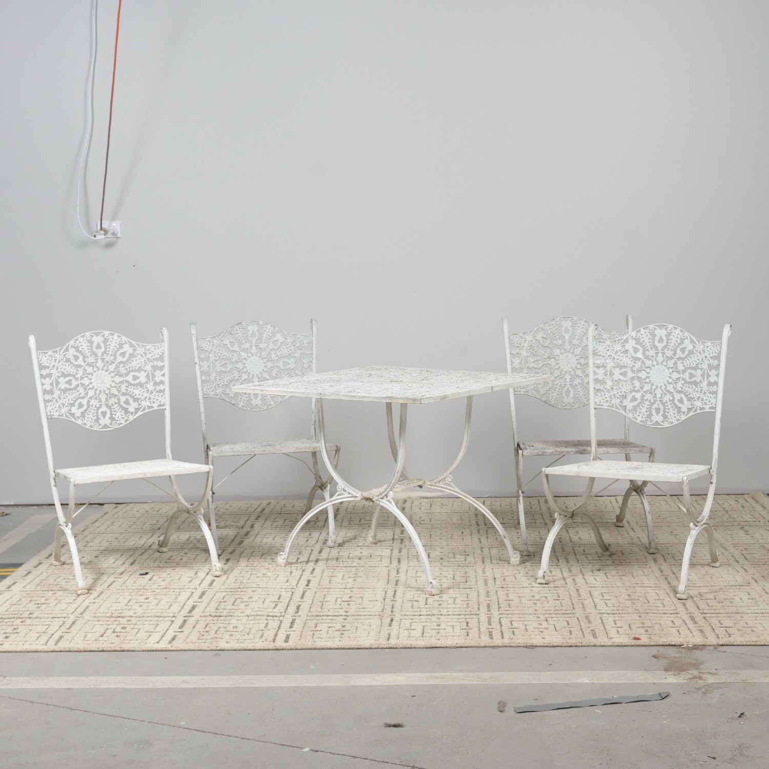A CAST ALLOY FIVE PIECE OUTDOOR SETTING (A/F) (CHAIRS 88H X 52W X 57D CM) (LEONARD JOEL DELIVERY: X-LARGE)