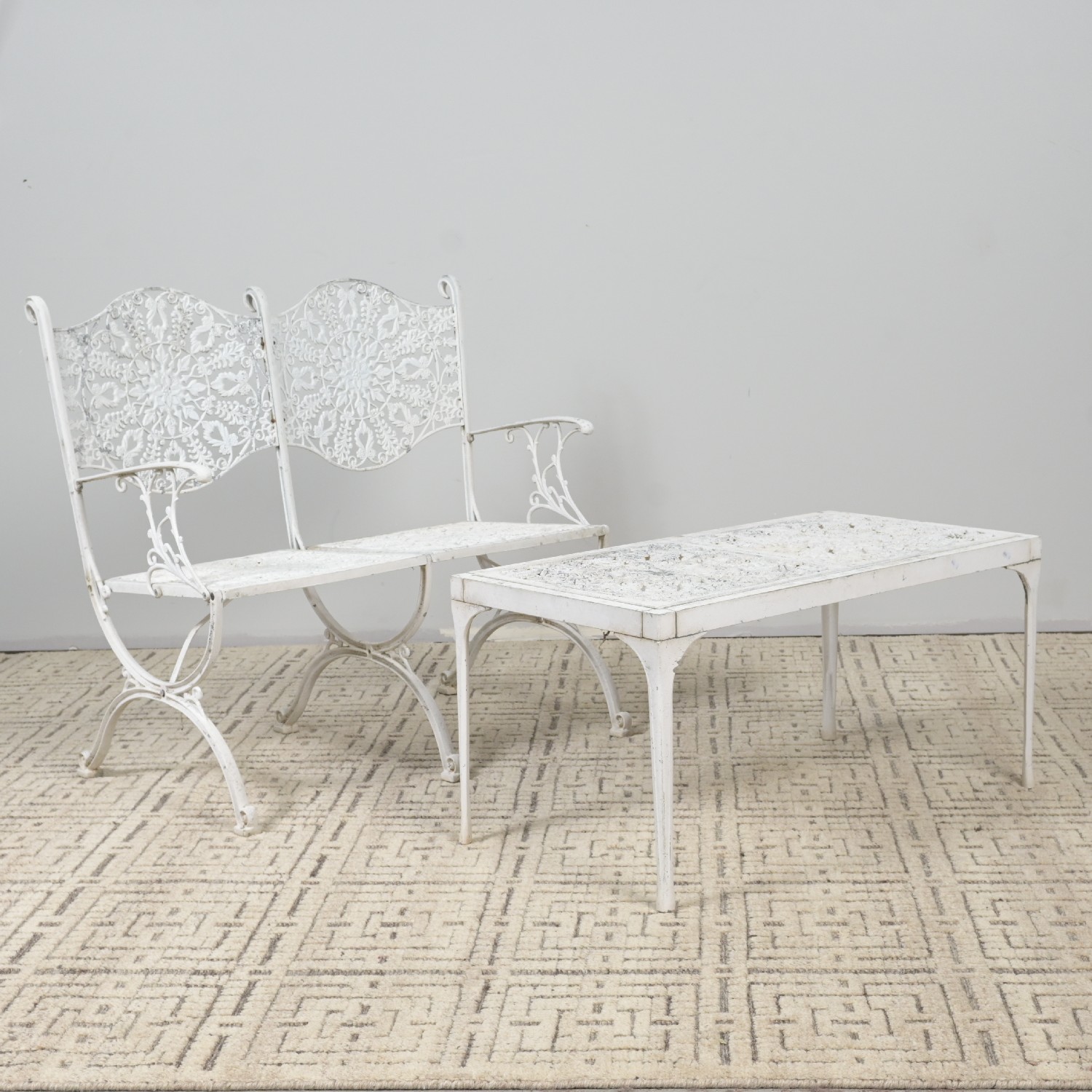 A VICTORIAN STYLE CAST ALLOY TWO SEATER BENCH WITH MATCHED COFFEE TABLE (A/F) (88H X 96W X 57D CM) (LEONARD JOEL DELIVERY: X-LARGE)