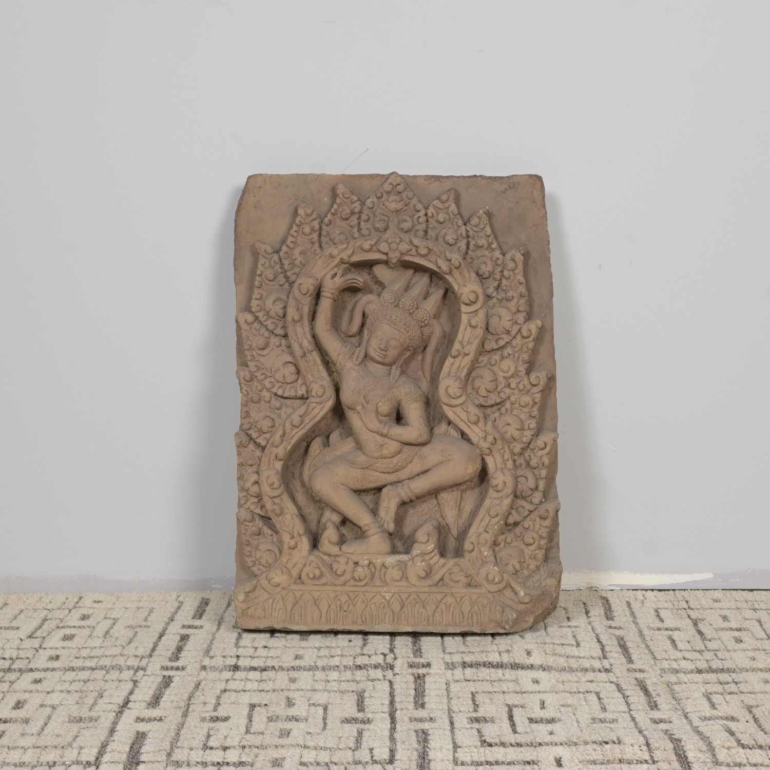 A KHMER STYLE CARVED SANDSTONE PLAQUE (70H X 48W CM) (THIS HEAVY ITEM MUST BE REMOVED BY CARRIERS AT THE CUSTOMER'S EXPENSE. LEONARD JOEL STAFF CANNOT ASSIST CARRYING THIS ITEM)