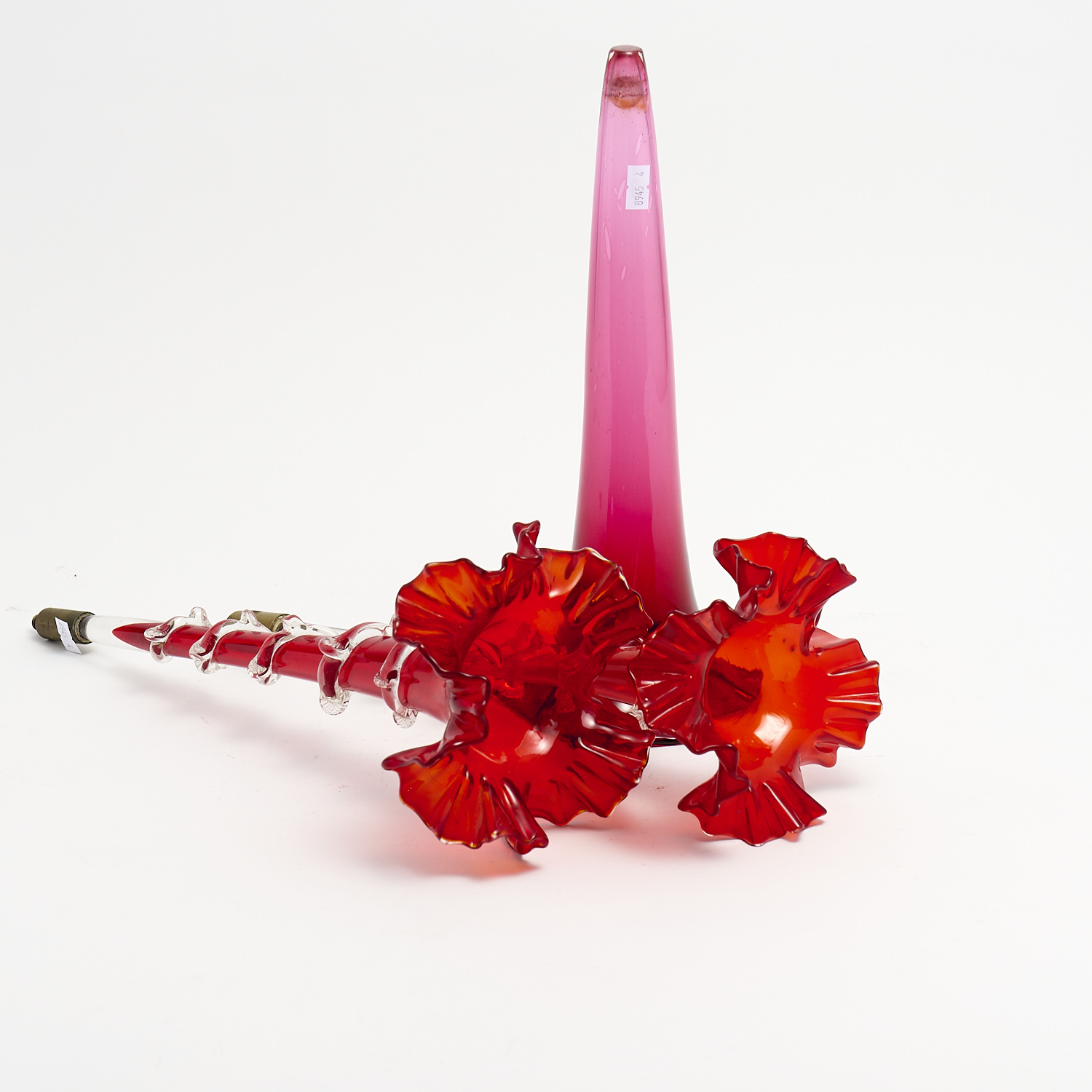 THREE RUBY GLASS EPERGNE TRUMPETS L.41.5CM (LONGEST), LEONARD JOEL DELIVERY SIZE: MEDIUM