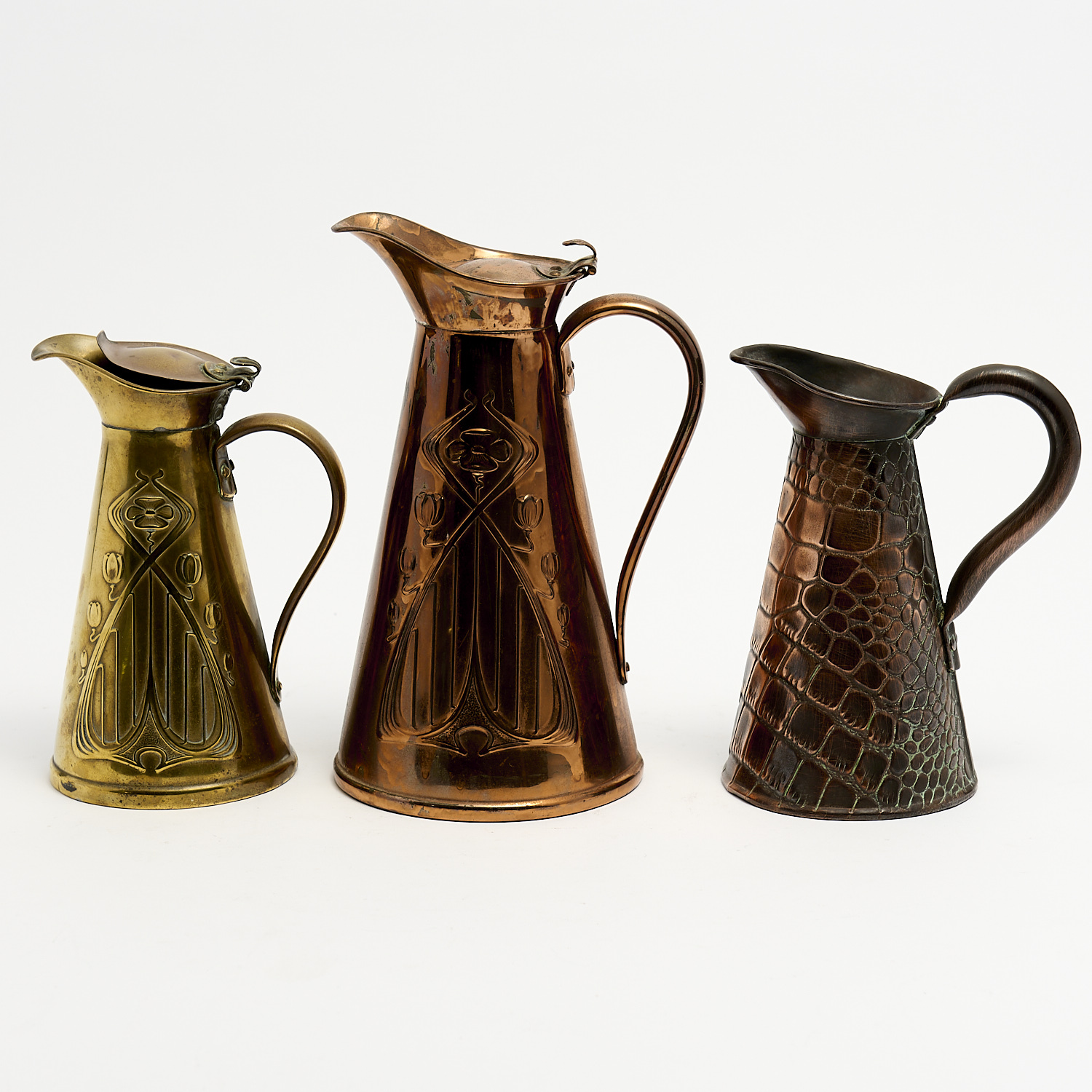 THREE ART NOUVEAU COPPER AND BRASS JUGS H.23CM (TALLEST), LEONARD JOEL DELIVERY SIZE: MEDIUM