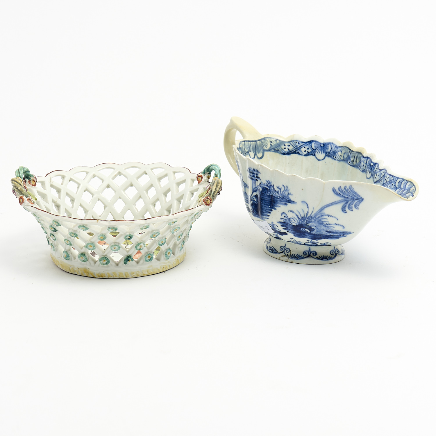 A RETICULATED CHELSEA PORCELAIN BASKET TOGETHER WITH AN ENGLISH 18TH C. BLUE AND WHITE SAUCE BOAT (A/F) W.16.5CM (LARGEST), LEONARD JOEL DELIVERY SIZE: SMALL