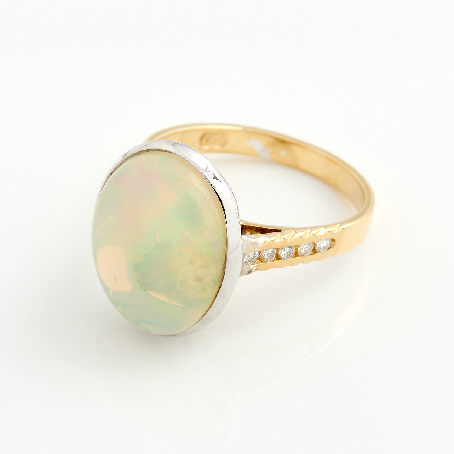 A WHITE OPAL AND DIAMOND RING IN 18CT TWO-TONE GOLD, THE OPAL WEIGHING 5.30CTS, THE DIAMONDS TOTALLING 0.15CTS (F/VS), SIZE R, 6.4GMS