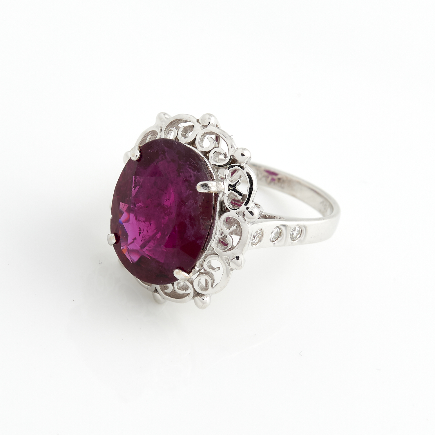 A TOURMALINE AND DIAMOND RING IN 18CT WHITE GOLD, THE TOURMALINE WEIGHING 7.40CTS, THE DIAMONDS TOTALLING 0.10CT, SIZE N