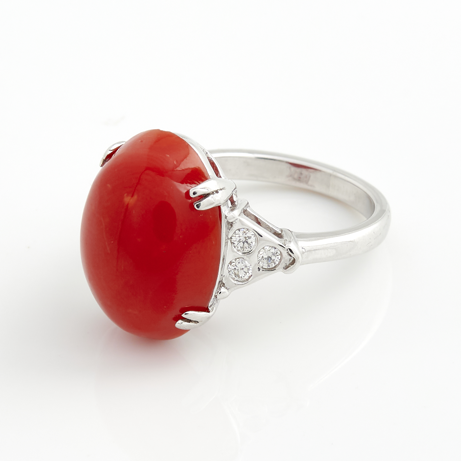 A CORAL AND DIAMOND RING IN 18CT WHITE GOLD, THE CORAL WEIGHING 10.22CTS, THE DIAMONDS TOTALLING 0.14CTS, SIZE N, 7.2GMS