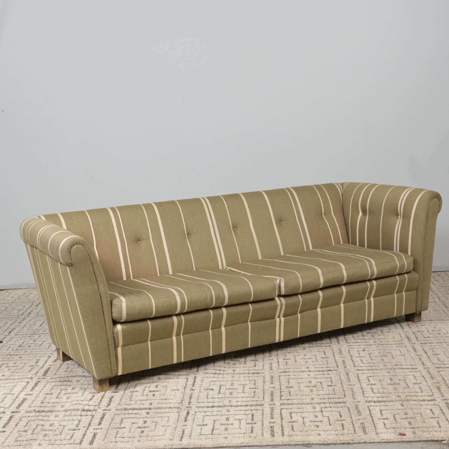 A MID-CENTURY DANISH THREE SEATER UPHOLSTERED SOFA (64H X 186W X 77D CM) (THIS HEAVY ITEM MUST BE REMOVED BY CARRIERS AT THE CUSTOMER'S EXPENSE. LEONARD JOEL STAFF CANNOT ASSIST CARRYING THIS ITEM)