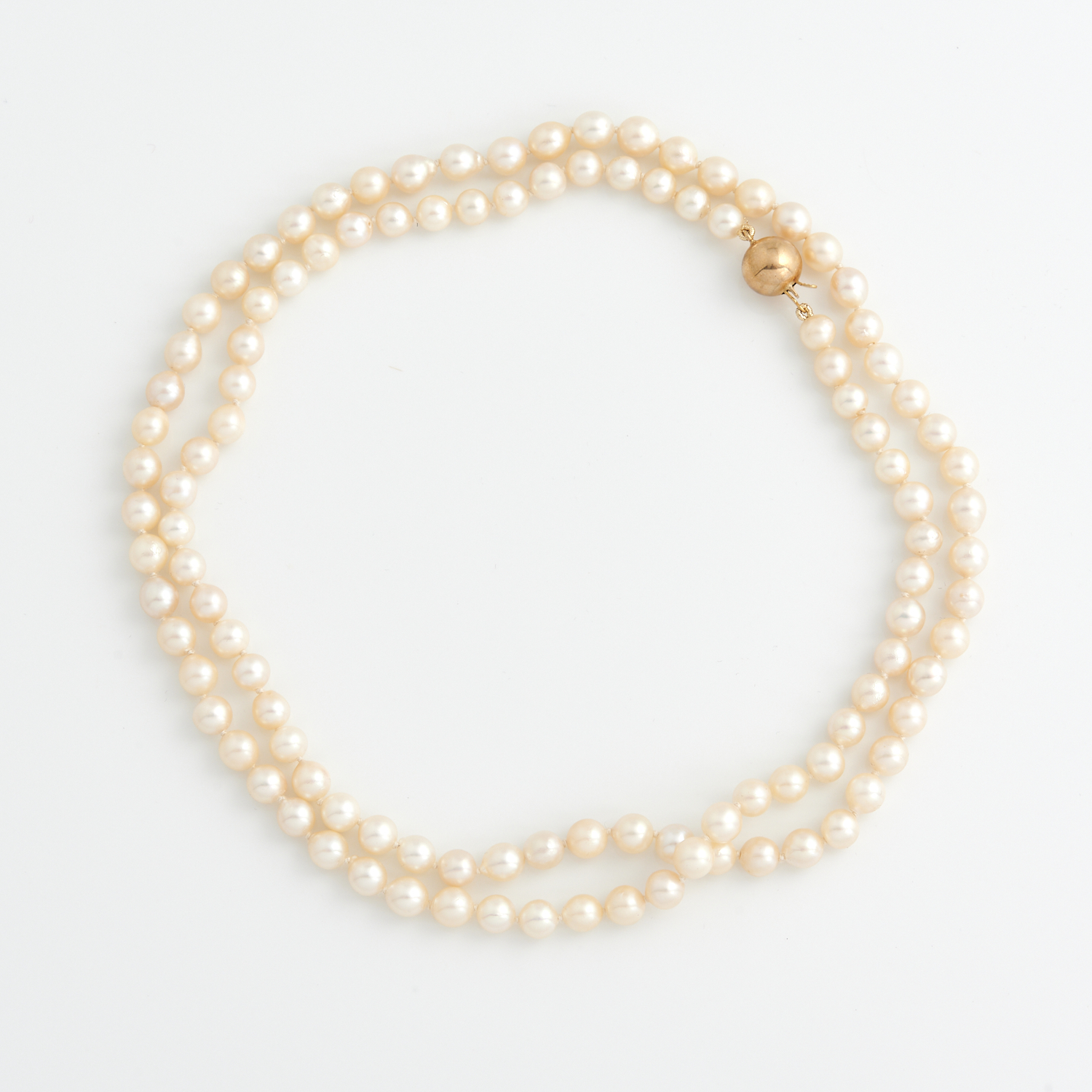 A STRAND OF AKOYA PEARLS TO A BALL CLASP IN 9CT GOLD, THE PEARLS MEASURING APPROXIMATELY 60MM, 810MM