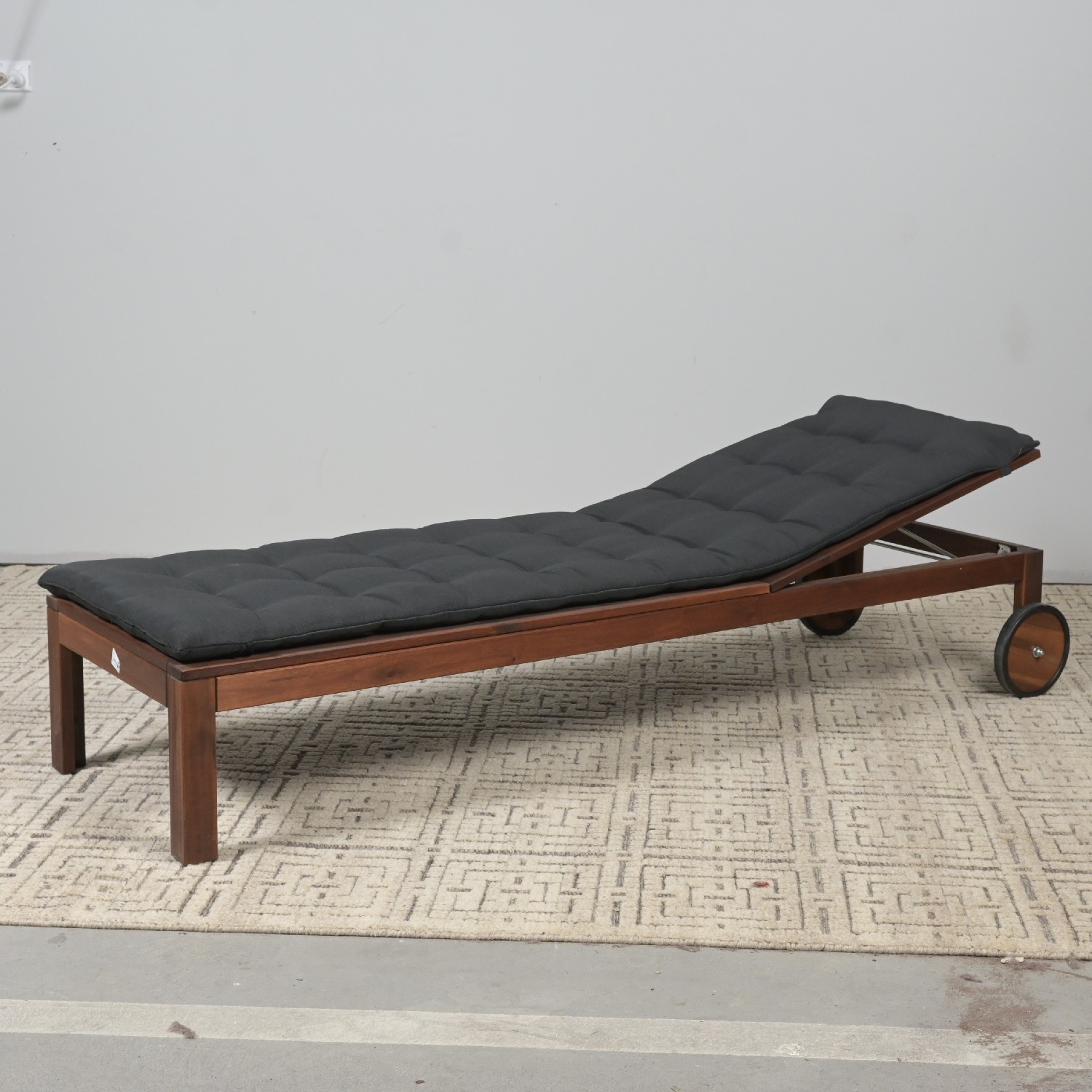 A HARDWOOD ADJUSTABLE HEIGHT SUN LOUNGE WITH CUSHION (A/F) (55H X 60W X 192D CM) (LEONARD JOEL DELIVERY: X-LARGE)