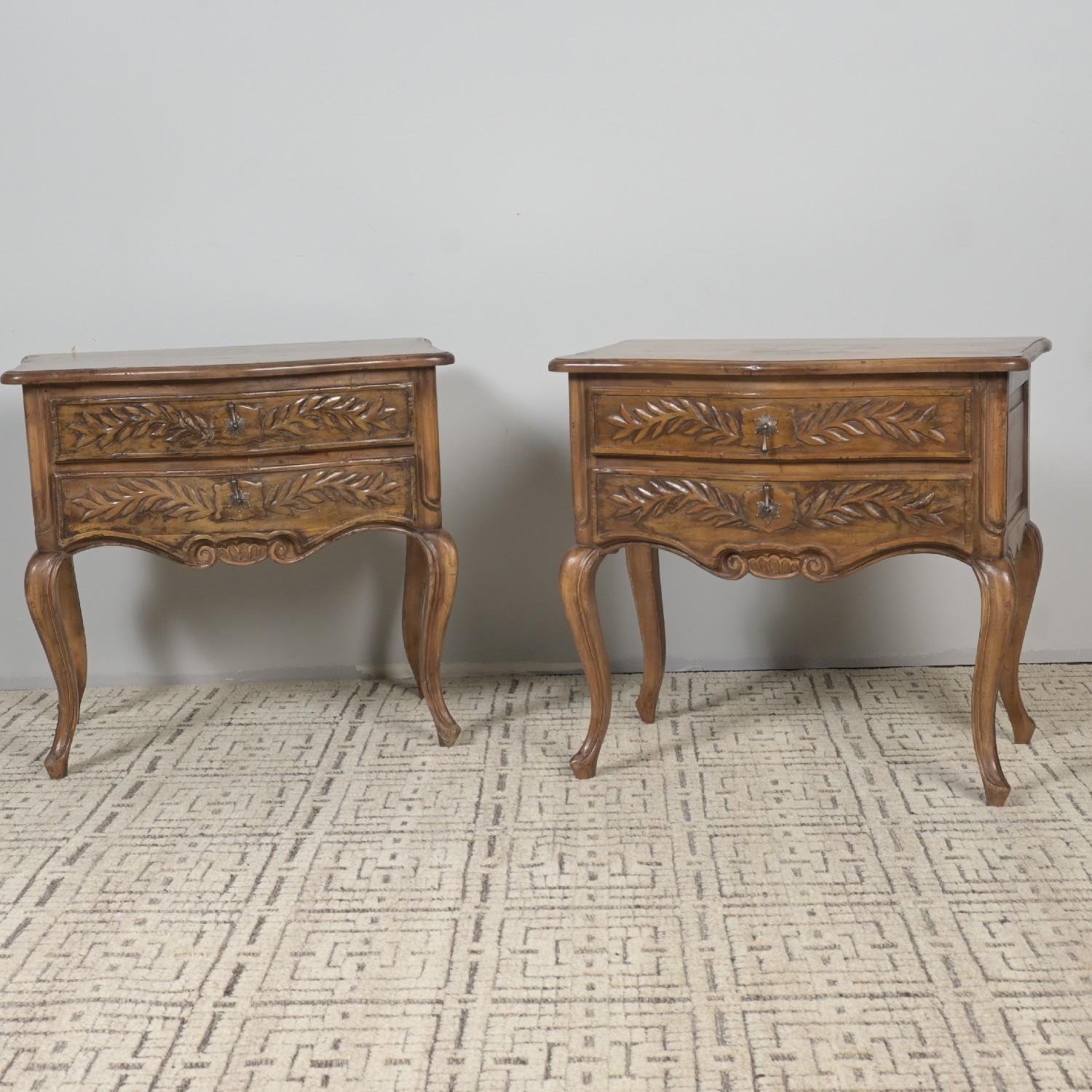 A PAIR OF FRENCH STYLE SERPENTINE BEDSIDE TABLES (74H X 77W X 47D CM) (LEONARD JOEL DELIVERY: X-LARGE)