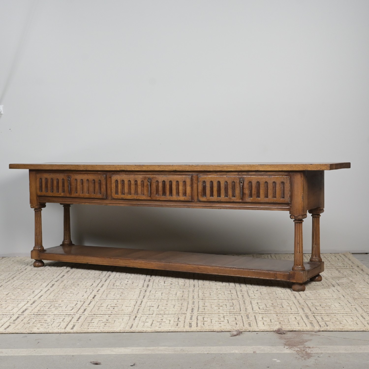 A SPANISH STYLE OAK CONSOLE WITH THREE DRAWERS AND POTSHELF (82H X 260W X 50D CM) (THIS HEAVY ITEM MUST BE REMOVED BY CARRIERS AT THE CUSTOMER'S EXPENSE. LEONARD JOEL STAFF CANNOT ASSIST CARRYING THIS ITEM)