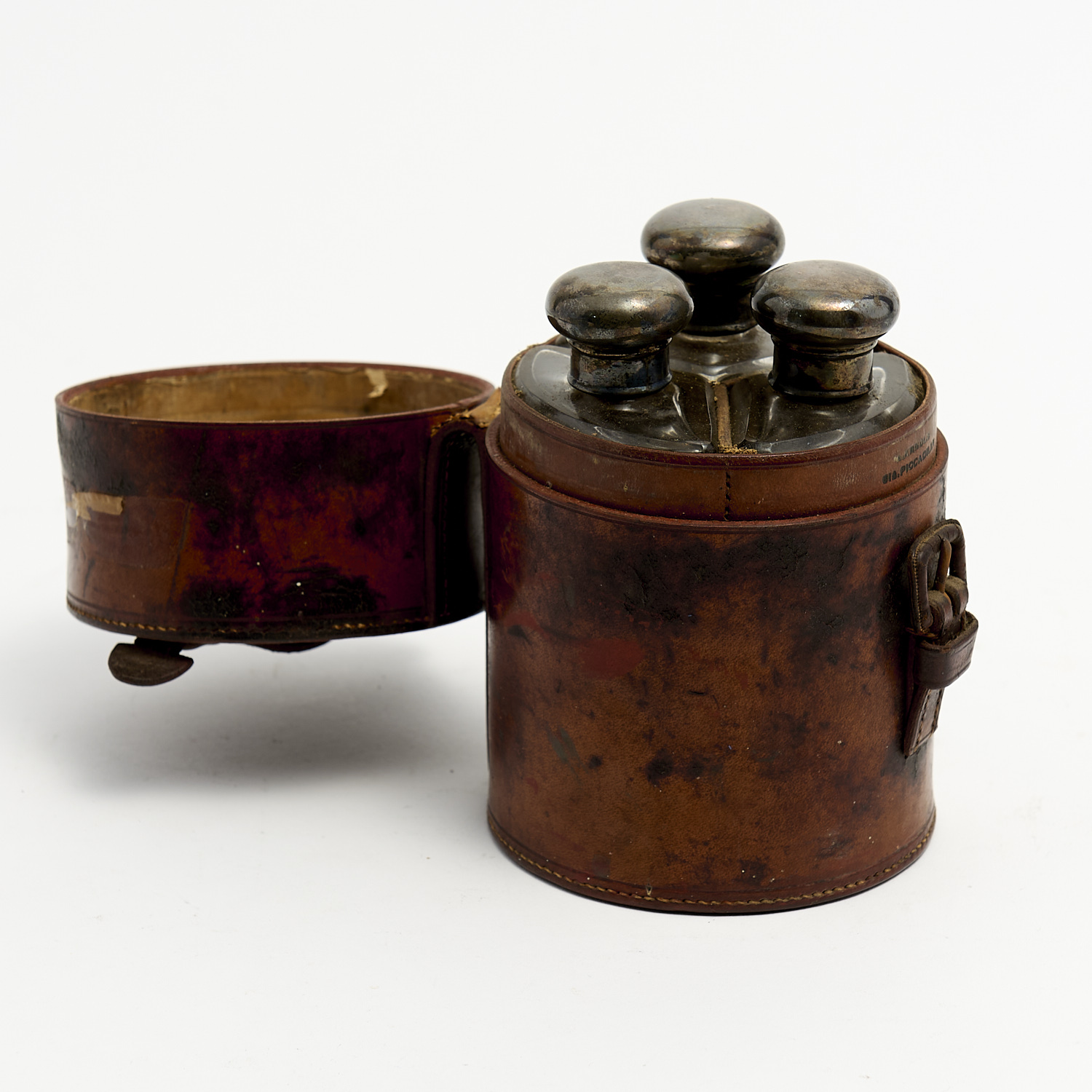 A CYLINDRICAL LEATHER CONTAINER WITH THREE STERLING SILVER LIDDED FLASKS H.14.5CM, LEONARD JOEL DELIVERY SIZE: SMALL
