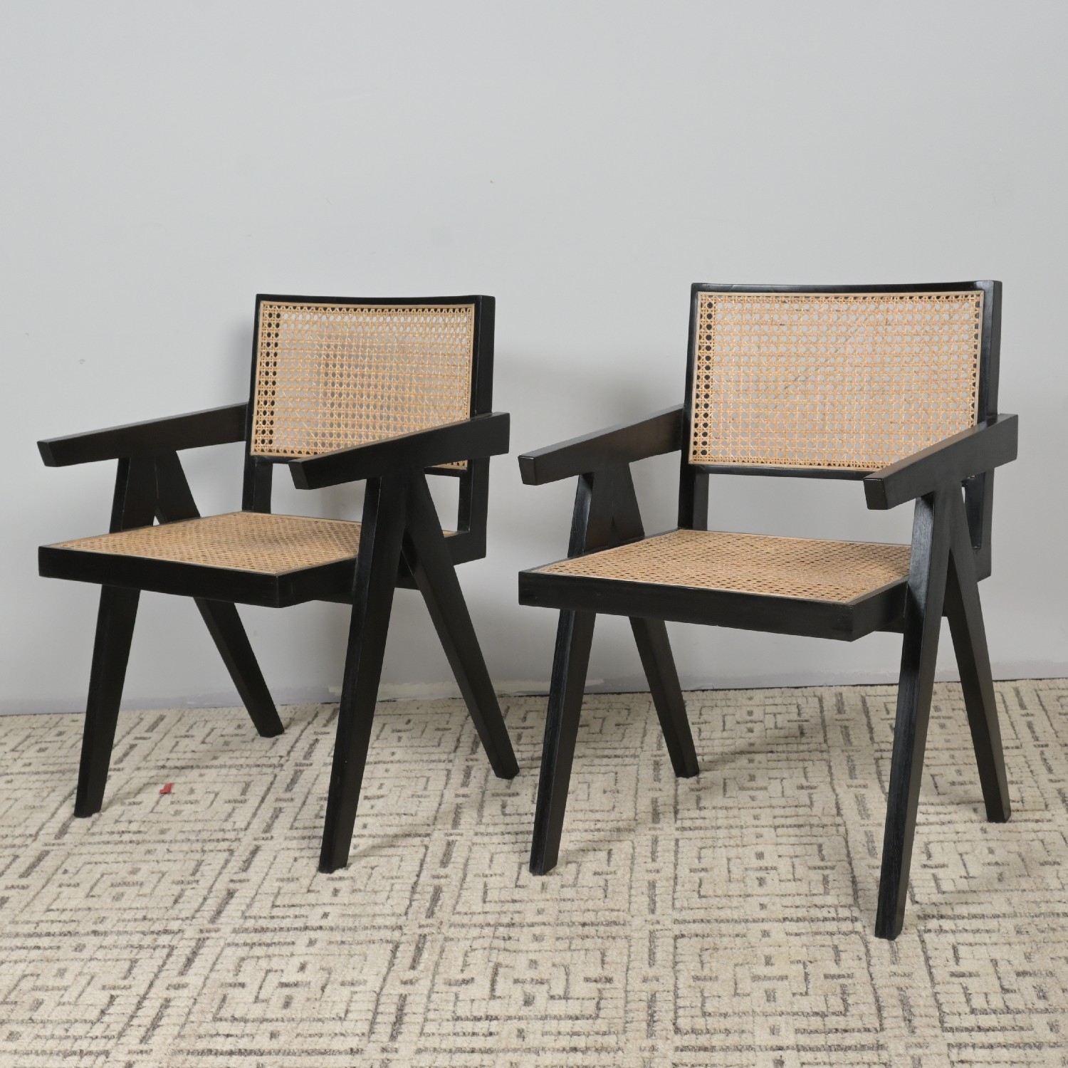 A PAIR OF TEAK AND RATTAN CARVER CHAIRS (82H X 56W X 59D CM) (LEONARD JOEL DELIVERY: X-LARGE)