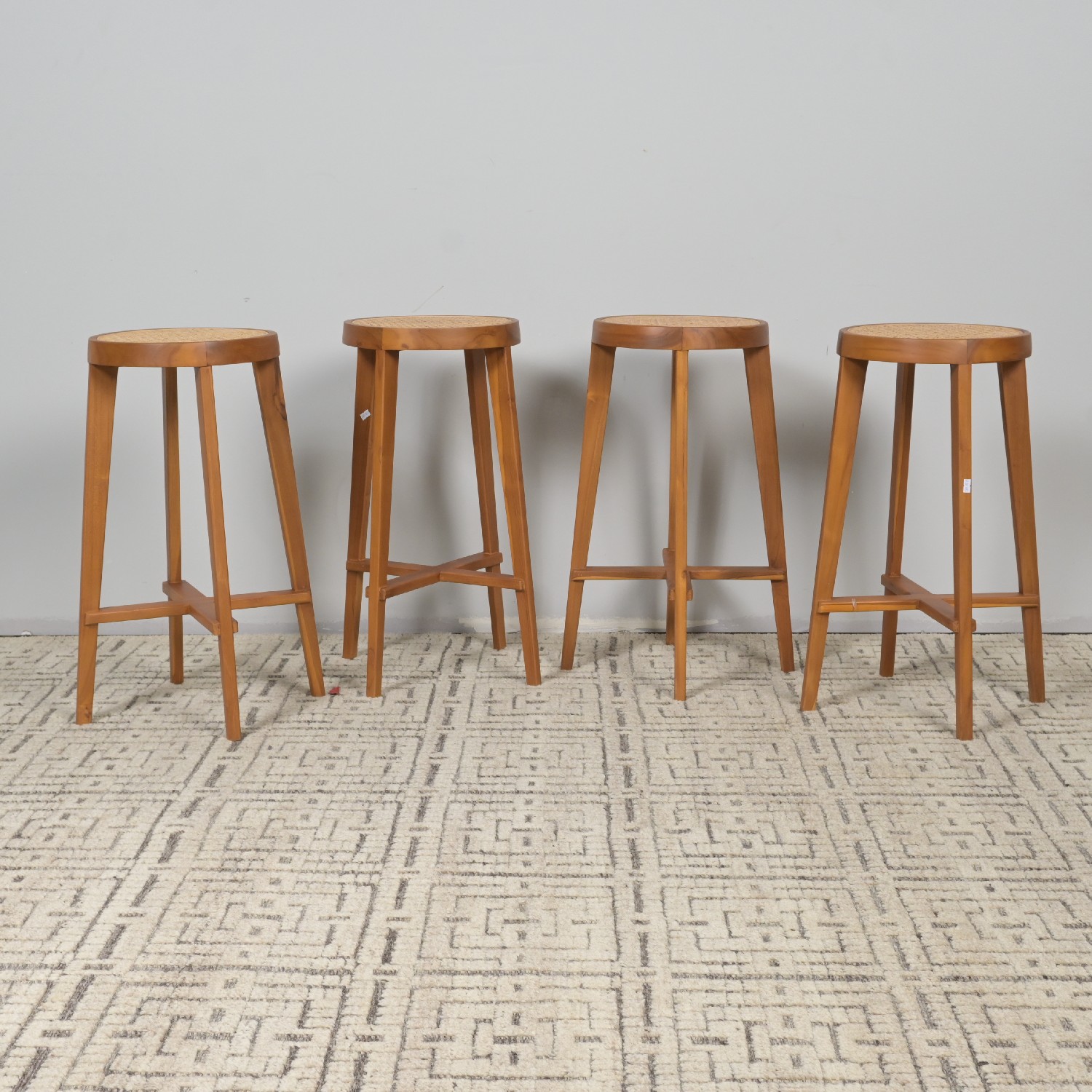 FOUR TEAK AND RATTAN BAR STOOLS (66H X 30DIA CM) (LEONARD JOEL DELIVERY: X-LARGE)