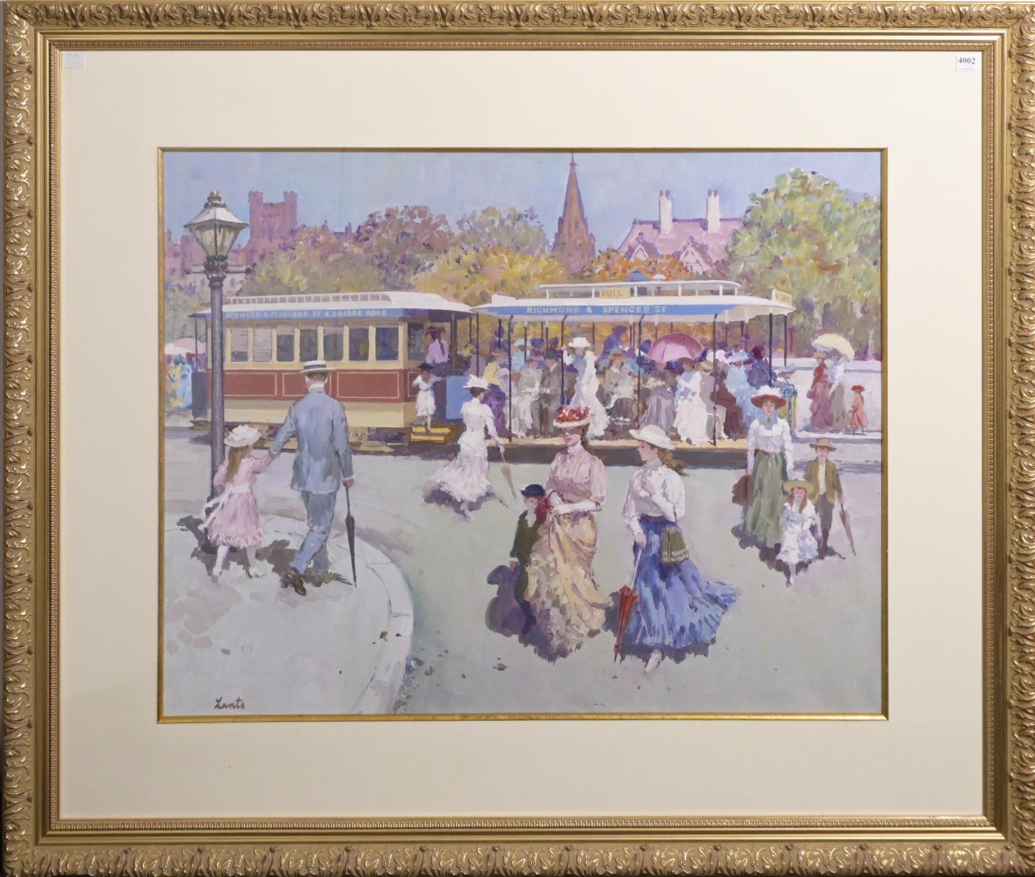 GERRARD LANTS, (ON THE TRAM), OIL ON CANVASBOARD, SIGNED LOWER LEFT, 59 X 74.5CM, FRAME SIZE: 91 X 106CM