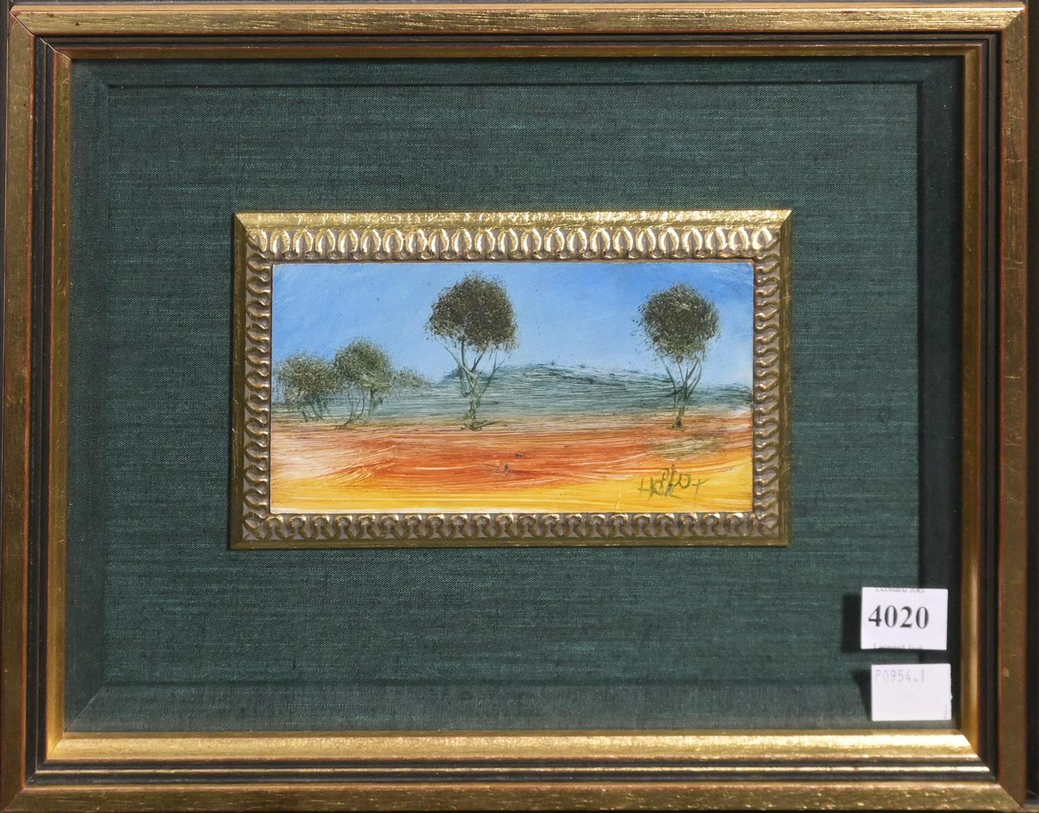 PRO HART, LANDSCAPE WITH TREES, OIL ON BOARD, SIGNED LOWER RIGHT, 7 X 14CM, FRAME SIZE: 26 X 33CM