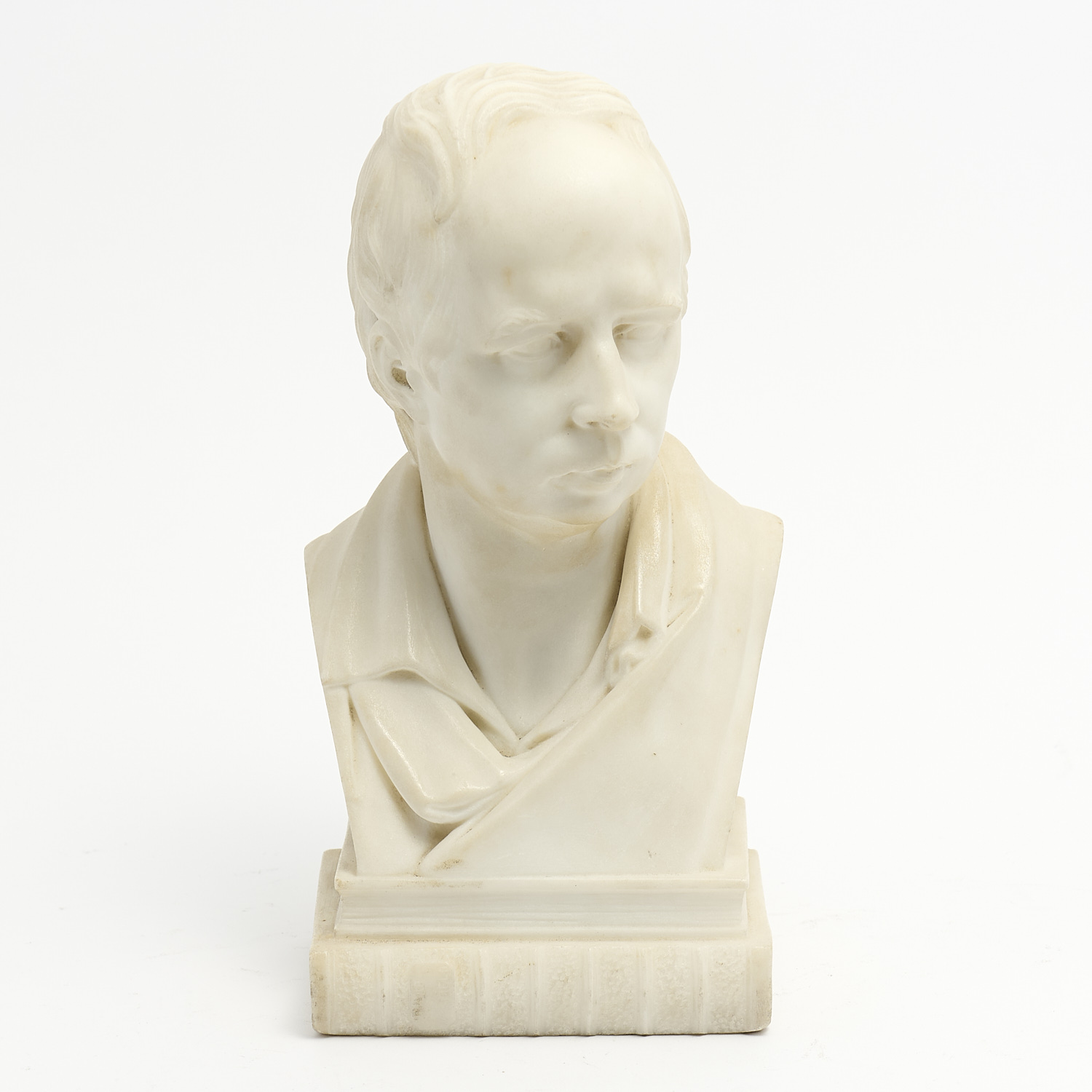 A MARBLE BUST OF OLIVER GOLDSMITH, SIGNED TO BACK H.28.5CM, LEONARD JOEL DELIVERY SIZE: MEDIUM