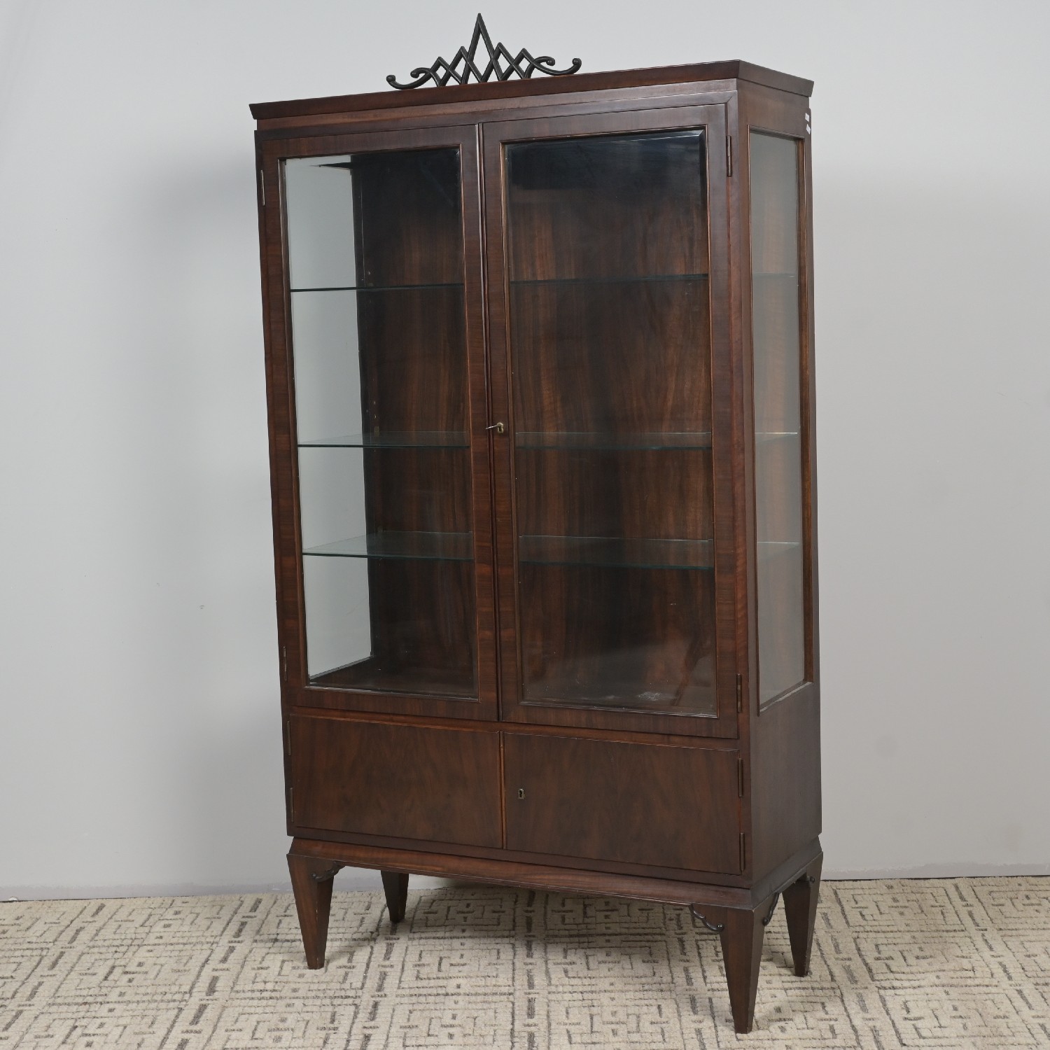 AN ART DECO WALNUT AND GLAZED DISPLAY CABINET (188H X 101W X 41D CM) (THIS HEAVY ITEM MUST BE REMOVED BY CARRIERS AT THE CUSTOMER'S EXPENSE. LEONARD JOEL STAFF CANNOT ASSIST CARRYING THIS ITEM)