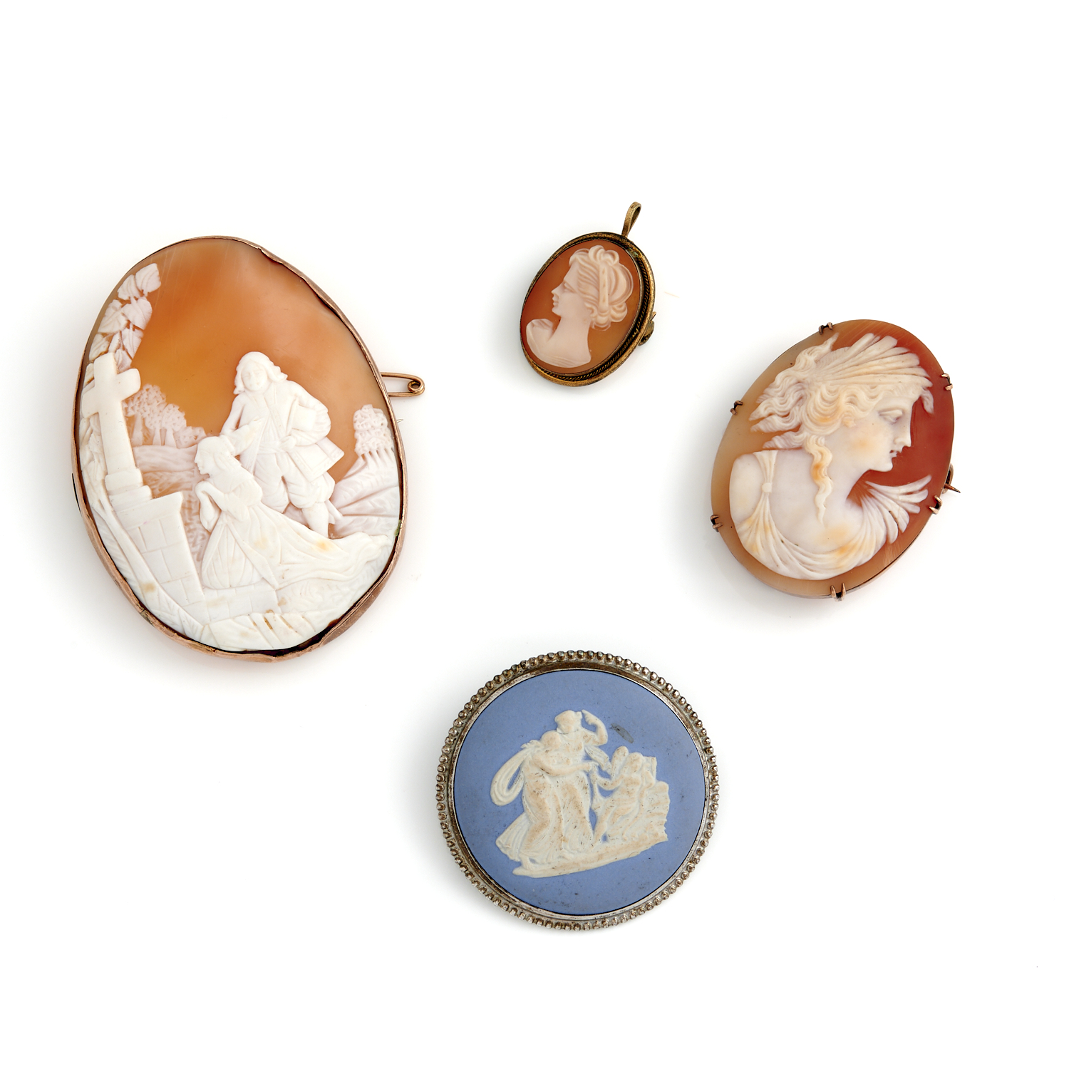A COLLECTION OF FOUR CAMEO BROOCHES IN GOLD PLATE, SILVER AND 9CT GOLD, INCLUDING ONE WEDGWOOD