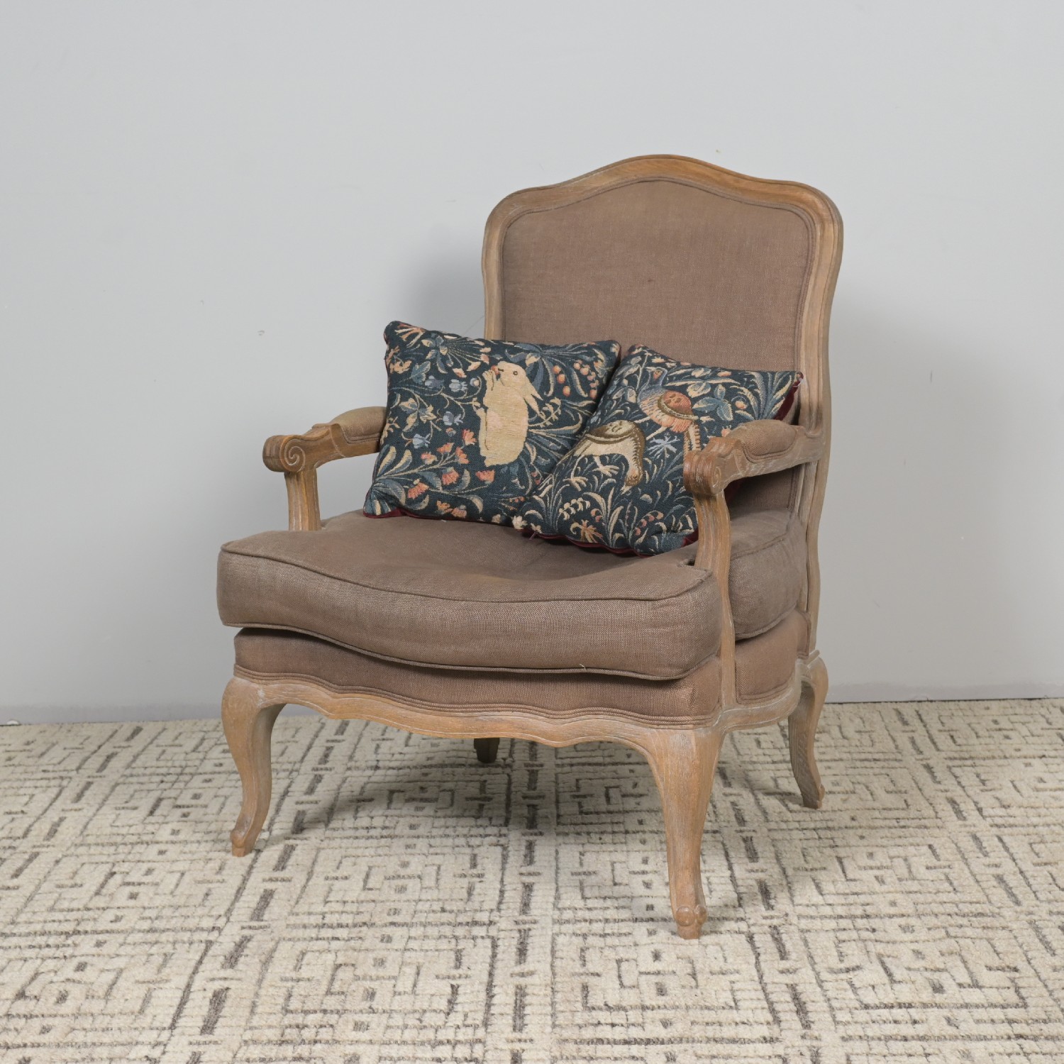A FRENCH LOUIS XV STYLE UPHOLSTERED ARMCHAIR (A/F) (95H X 72W X 62D CM) (LEONARD JOEL DELIVERY: LARGE)