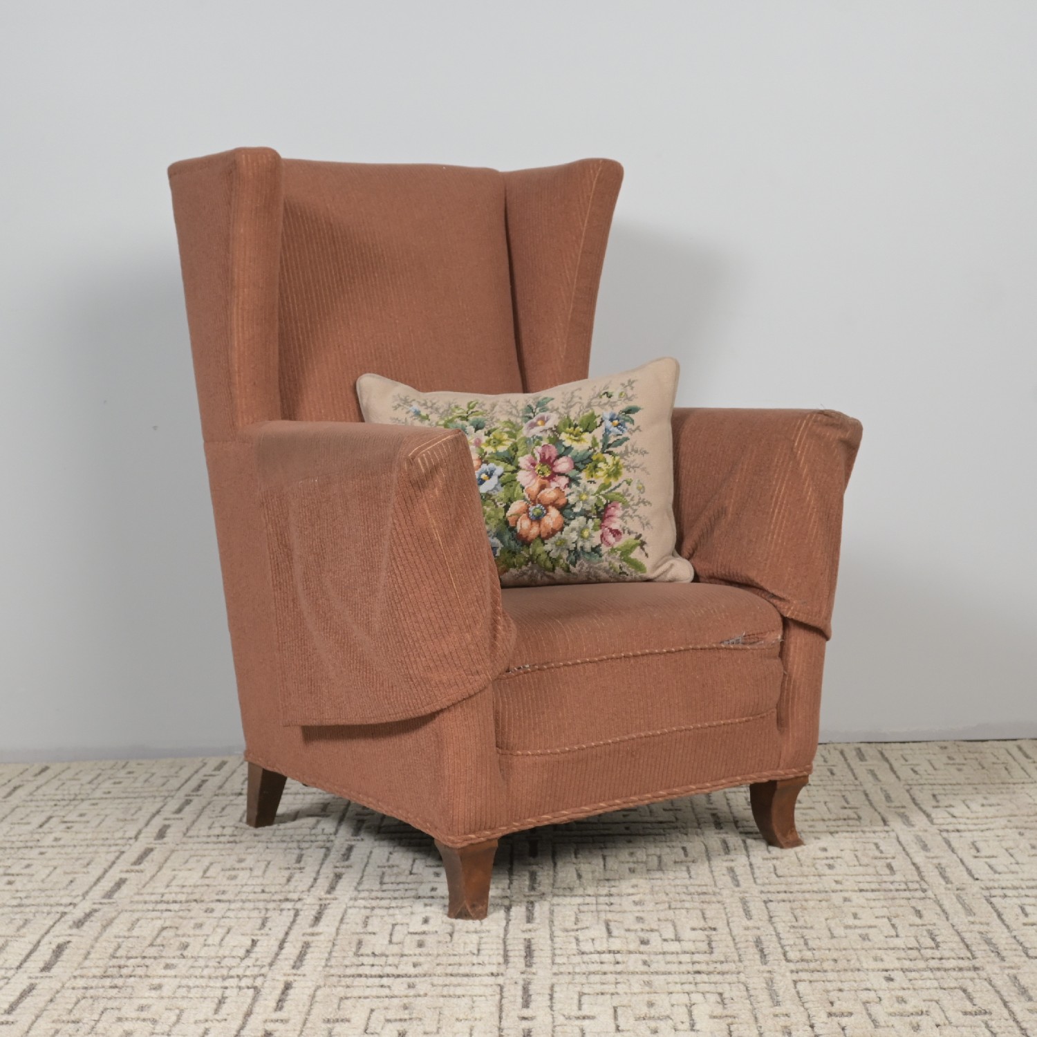 AN UPHOLSTERED WINGBACK ARMCHAIR (A/F) (THIS HEAVY ITEM MUST BE REMOVED BY CARRIERS AT THE CUSTOMER'S EXPENSE. LEONARD JOEL STAFF CANNOT ASSIST CARRYING THIS ITEM)