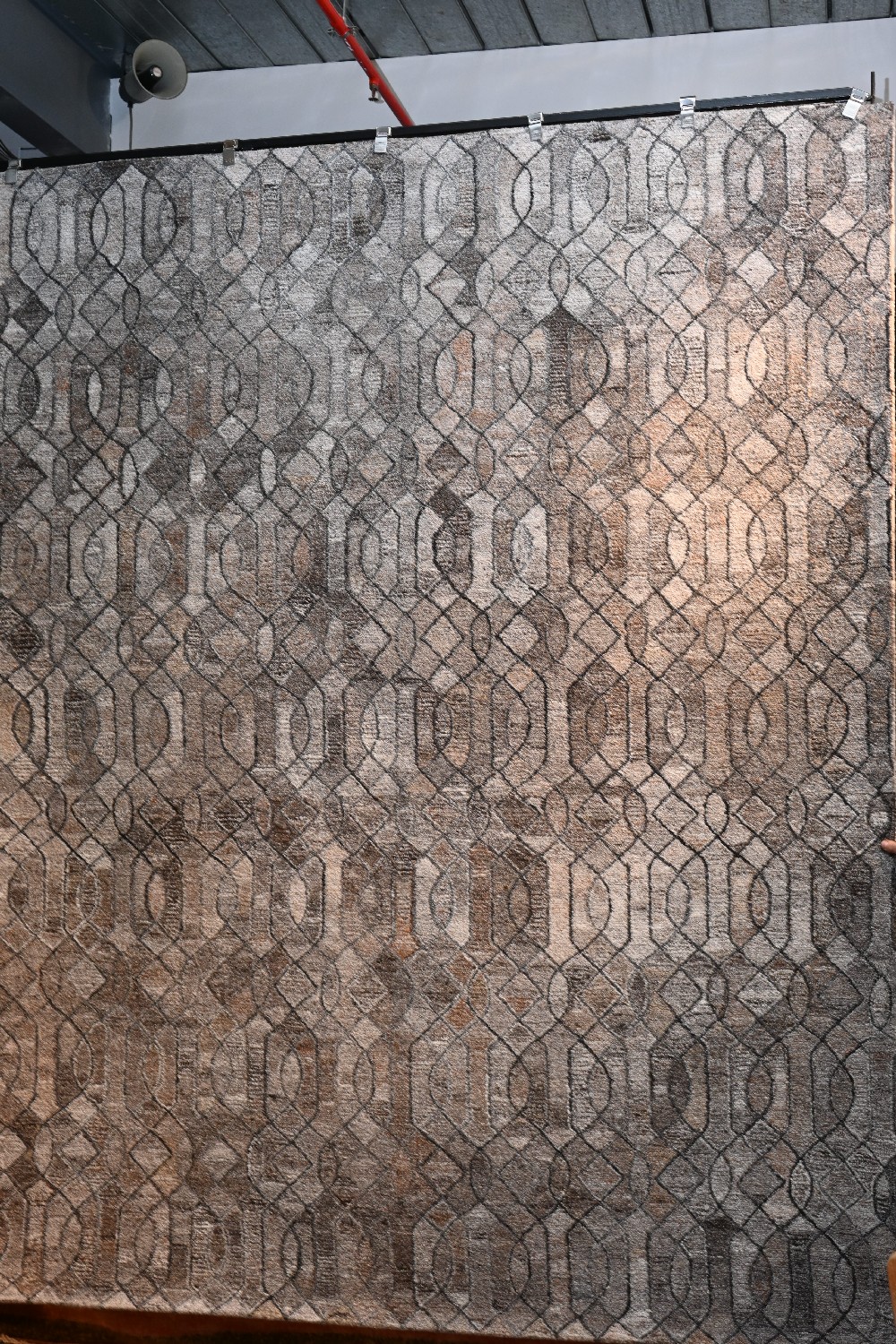A NEW MOSAIC COLLECTION RUG. WOOL PILE, HANDMADE TUFTED LOOM, EMBOSSED DESIGN. VERY SOLID AND STURDY. IN SILVER AND GREY TONES. SIZE: 242 X 304 CM ORIGIN: INDIA