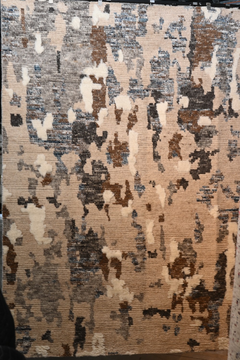 BRAND-NEW PRISTINE MODERN CONTEMPORARY MARRAKESH COLLECTION RUG, 100% WOOL -WARP- WEFT PILE, HAND MADE, DECORATIVE- FASHIONABLE SOFT PLUSH PILE. IN TONES OF IVORY, GREY, AND CHARCOAL WITH A HINT OF BLUE. SIZE: 245 X 301 CM-ORIGIN: INDIA – RRP: $2,900 CONDITION: NEW AND PRISTINE DOCUMENTATION OF AUTHENTICITY INCLUDED.