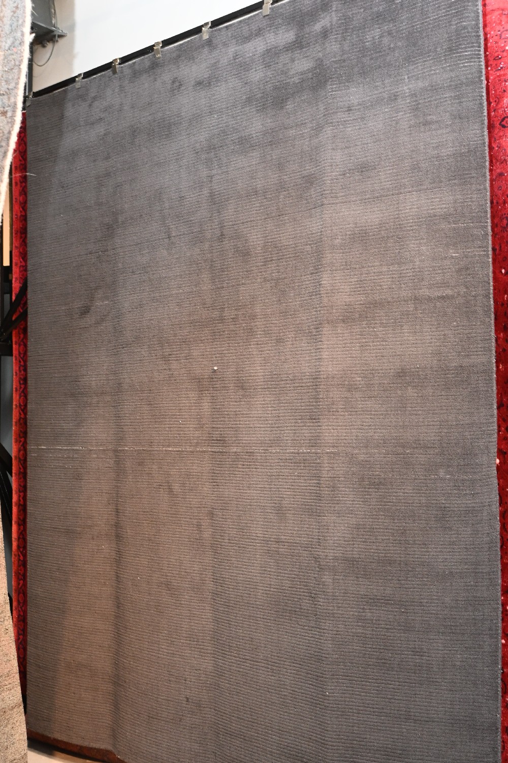 A NEW, MODERN CAPRI COLLECTION HANDMADE LOOM RUG, 100% WOOL AND VISCOSE SILK TEXTURE, IN DARK GREY TONES WITH SILVER LOOPS. ORIGIN: INDIA SIZE: 245 X 305 CM