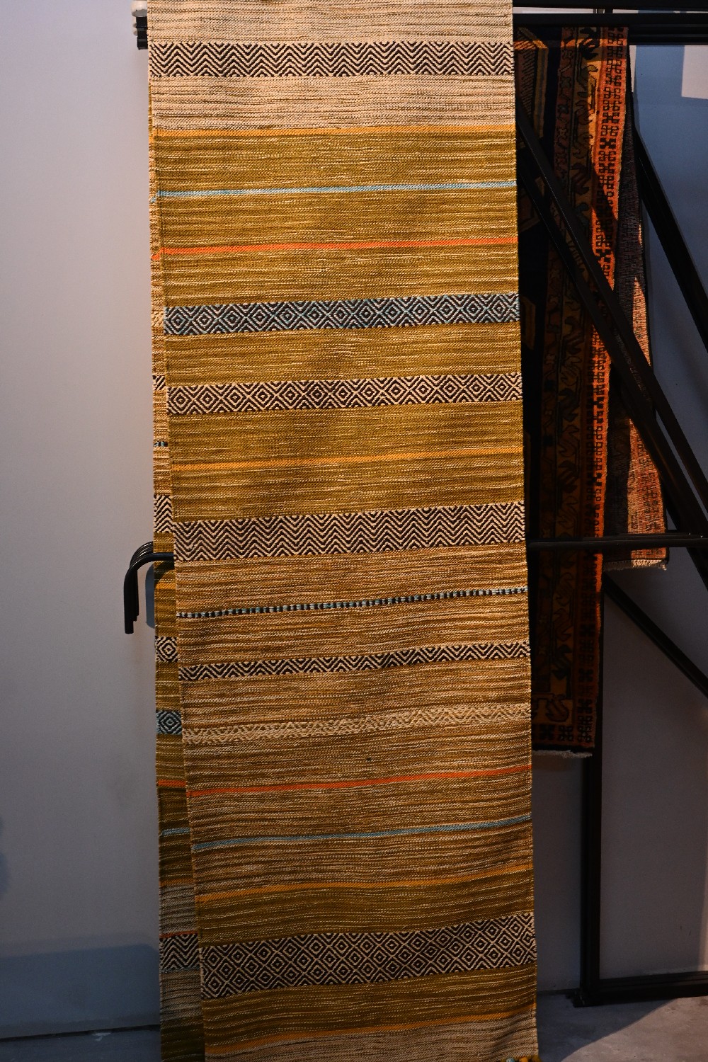 A BRAND-NEW EXTRA LONG DENSELY HAND-WOVEN RAJASTHANI KILIM RUNNER. REVERSABLE. MADE FROM THE FINEST COTTON FLEECE. IN GREEN TONES. SIZE: 500 X 80 CM-ORIGIN: JAIPUR