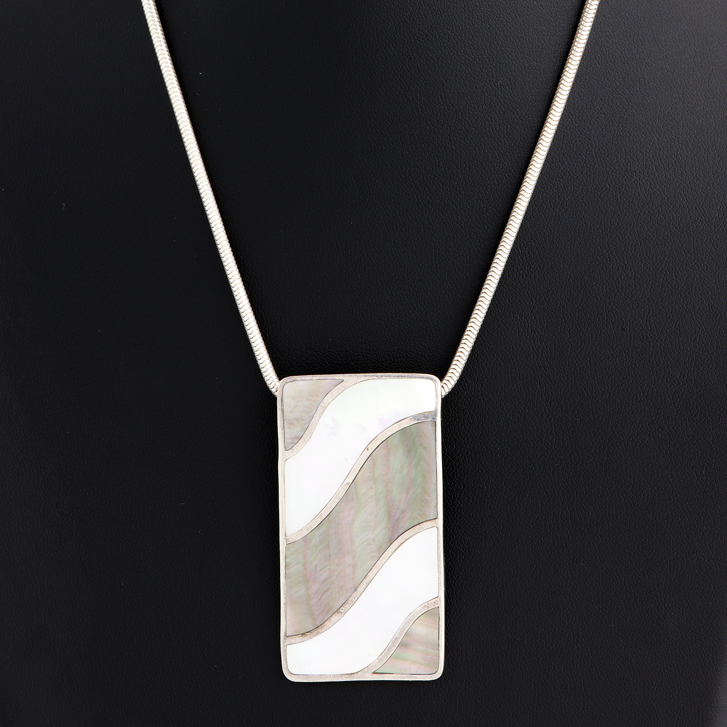 A LARGE MOTHER OF PEARL PENDANT NECKLACE IN STERLING SILVER, THE PENDANT MEASURING 30MM X 59MM, 720MM