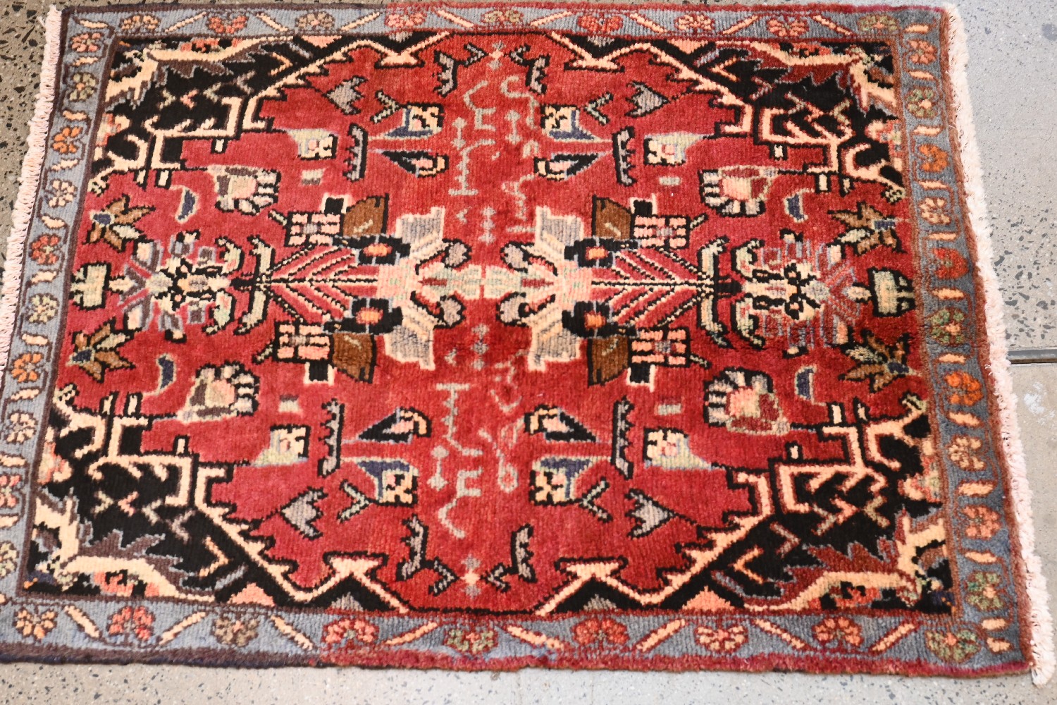 A SMALL PERSIAN HAMADAN RUG. 100% WOOL HAND-KNOTTED WITH A CLASSIC DESIGN OF ALL OVER BLOSSOMING FLORAL SPRAYS AND GEOMETRIC MOTIFS ON A RED FIELD. SIZE: 90 X 69 CM ORIGIN: PERSIA