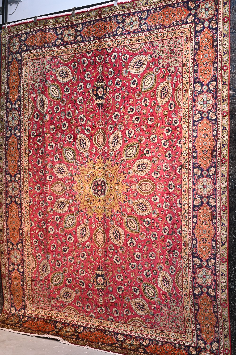 A PERSIAN TABRIZ AZARSHAHR CARPET. DENSE THICK SOLID WOOL PILE. IN EXCELLENT CONDITION. CLASSIC TABRIZ DESIGN OF CENTRAL ANCHORED FLORAL CHANDELIER MEDALLION IN A PISTACHIO GREEN ON A VIBRANT RICH RED TONE FIELD. WITH FLORAL SPRAYS, PALMETTES. MAJOR CARTOUCHE BORDER IN FRENCH BLUE, ORANGE IN A ROYAL BLUE FIELD. ALL OVER OF RICH ROYAL TONES. CONDITION: EXCELLENT GALLERY CONDITION SIZE: 352 X 255 CM ORIGIN: PERSIA - DOCUMENTATION OF AUTHENTICITY INCLUDED.