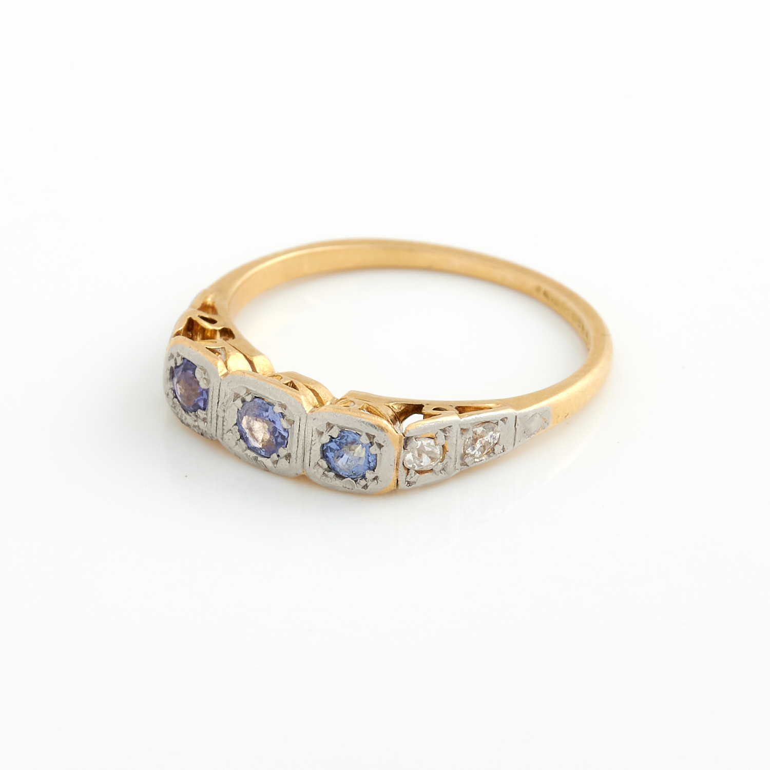 AN ANTIQUE SAPPHIRE AND DIAMOND RING IN 18CT GOLD AND PLATINUM, SIZE K, 2.1GMS