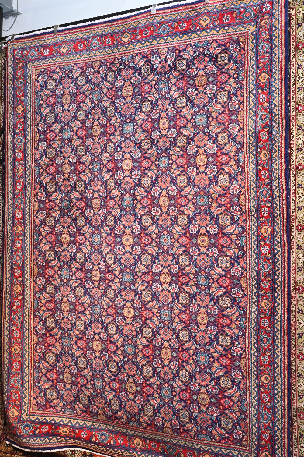 A PERSIAN SAROUQ CARPET. 100% WOOL, DENSE PILE, FINELY HAND-KNOTTED WEAVE WITH TRADITIONAL DESIGN OF LARGE ALL OVER HERATI PATTERNS IN A ROYAL PERSIAN BLUE FIELD, THE BORDER OF GEOMETRIC MOTIFS AND ROSETTES ON RUBY RED. SIZE: 327 X 230 CM ORIGIN: PERSIA