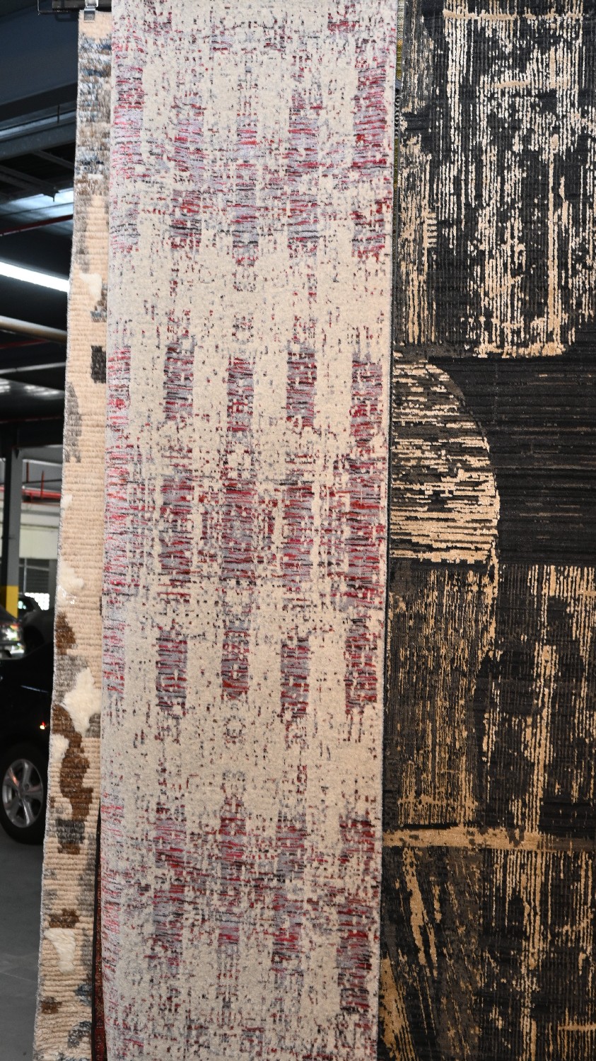 BRAND NEW MODERN CONTEMPORARY HALL RUNNER. WOOL AND TENCEL SILK-SOLID PLUSH PILE. HANDMADE LOOM. IN IN GREY, CHARCOAL AND MAGENTA TONES. SIZE: 291 X 79 CM-ORIGIN: INDIA – RRP: $780 CONDITION: BRAND NEW DOCUMENTATION OF AUTHENTICITY INCLUDED.2