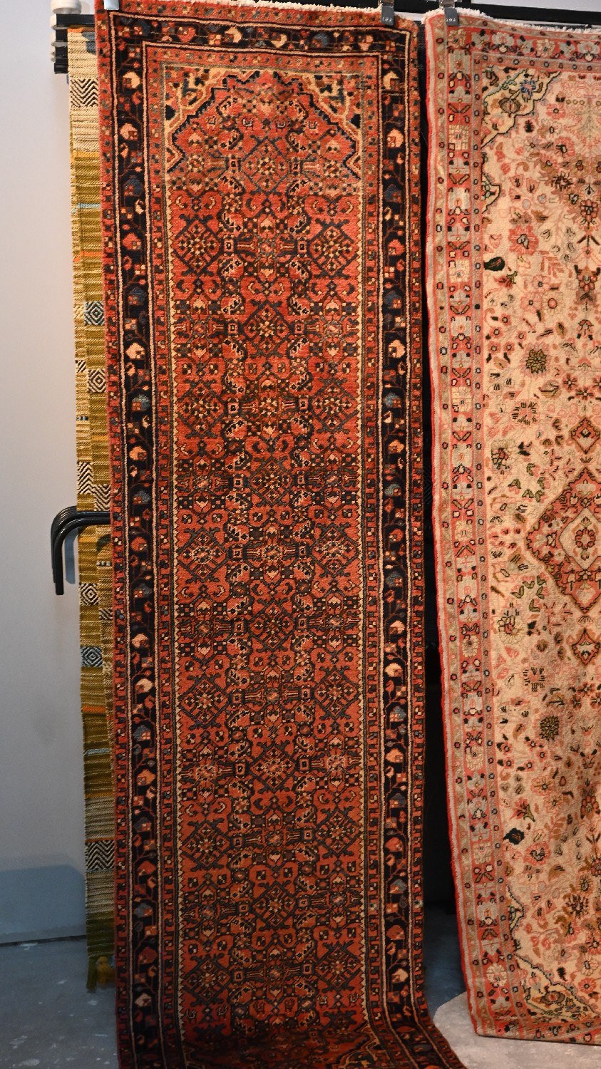 PERSIAN HOSSAINABAD HALL RUNNER. 100% WOOL PILE. SOLID VILLAGE WEAVE FROM THE HAMADAN REGION. WITH TRADITIONAL DESIGN OF ALL-OVER HERATI MAHI PATTERNS IN A SOFT RED FIELD. BORDER OF FLORAL MOTIFS. SIZE: 289 X 77 CM-ORIGIN: PERSIA – RRP: $1,200 CONDITION: VERY CLEAN, EX GALLERY DOCUMENTATION OF AUTHENTICITY INCLUDED.
