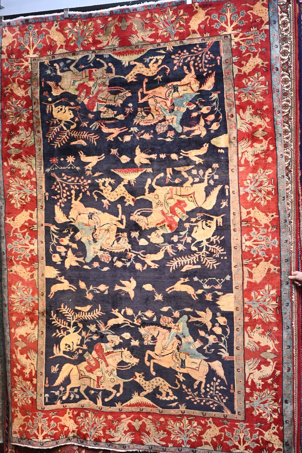 A PERSIAN GHOLTOGH BIDJAR,100% HAND KNOTTED WOOL, VEGETABLE DYES. ALL OVER PICTORIAL DESIGN OF 'PRINCES ON HORSEBACK' ON A ROYAL BLUE PERSIAN FIELD OF DEER, LEOPARDS, PARROTS AND ALL OVER FLORAL AND LEAF MOTIFS, THE BORDER OF DEER AND ANIMAL MOTIFS WITH GREEN FOLIAGE ON A RED FIELD ORIGIN: IRAN SIZE: 295 X 200 CM
