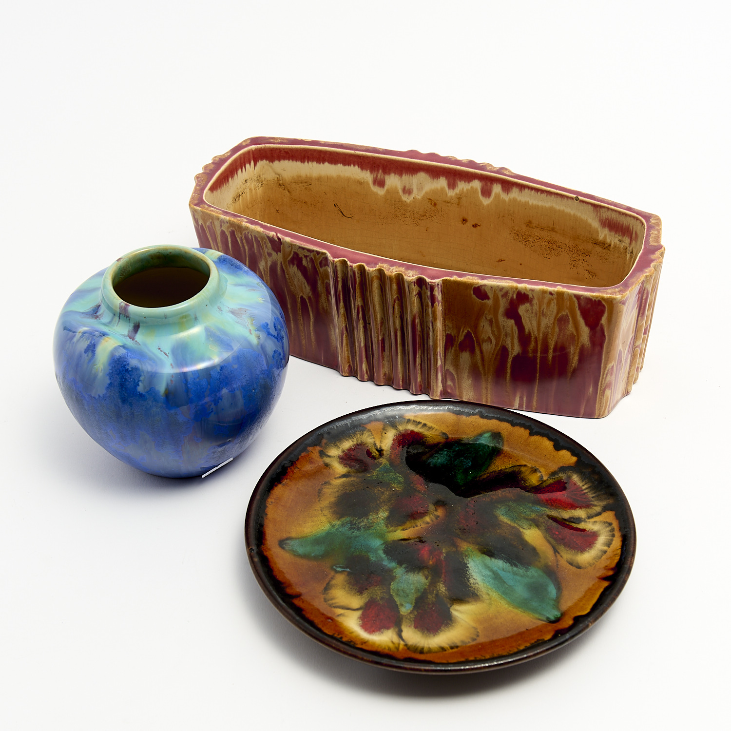 THREE POTTERY ITEMS INCLUDING A TROUGH PLANTER, FRENCH VASE, AND A GLAZED PLATE L.32CM (LONGEST), LEONARD JOEL DELIVERY SIZE: LARGE