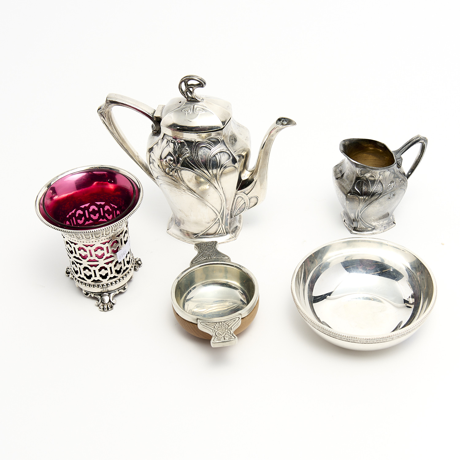 A COLLECTION OF DECORATIVE SILVER PLATE INCLUDING A WMF ART NOUVEAU POT AND CREAMER, A CHRISTOFLE BOWL AND VASE WITH LINER H.16CM (TALLEST), LEONARD JOEL DELIVERY SIZE: MEDIUM