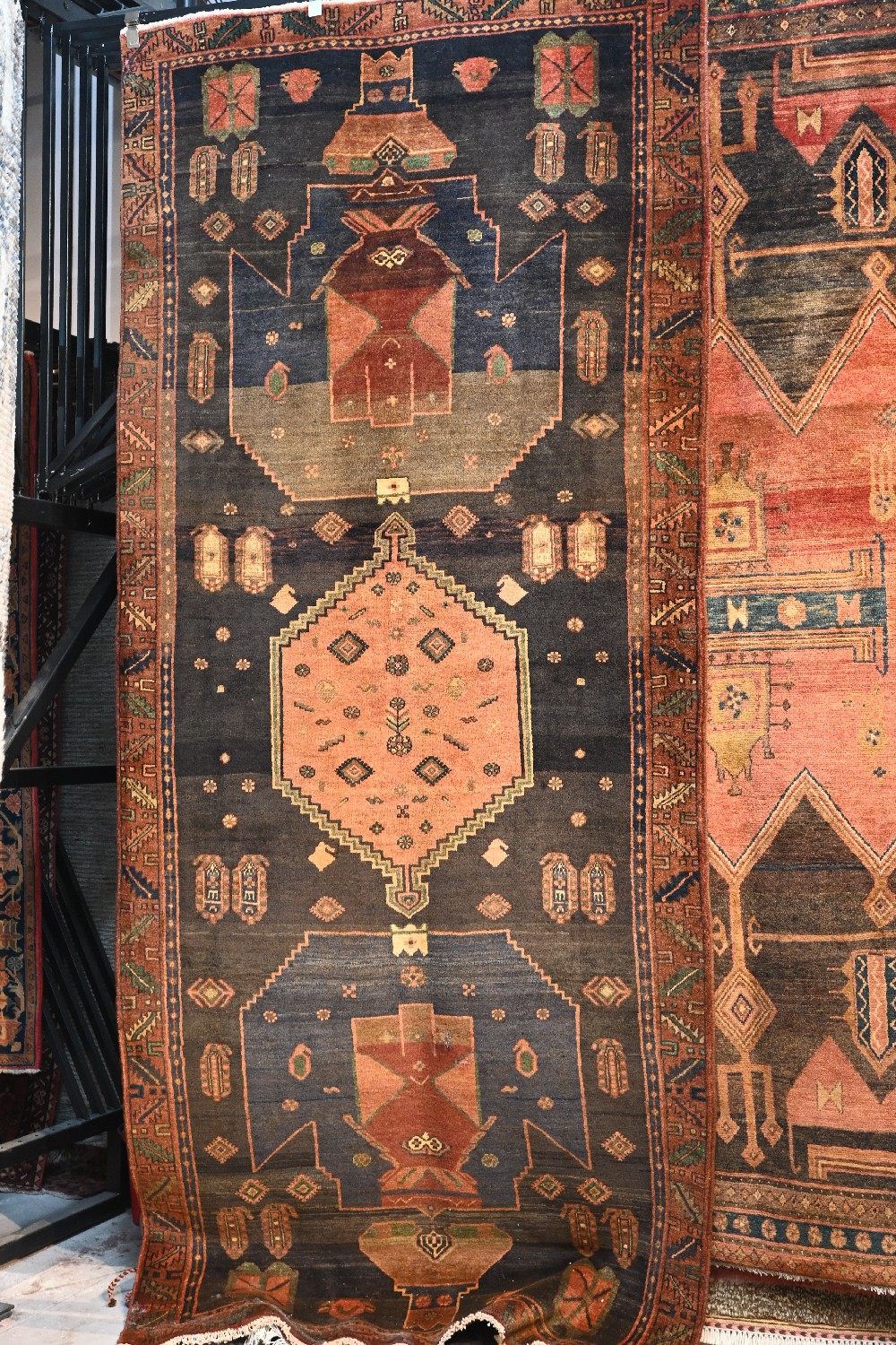 A LARGE PERSIAN TIRBAL CIRCA 1970'S GHOLTOGH RUG, 100% WOOL, DENSE AND SOLID. HAND- KNOTTED TRIBAL WEAVE FROM THE KURDISTAN REGION AND TRIBAL DESIGN OF BOLD TRIPLE ANCHORED MEDALLIONS ON A DEEP NAVY BLUE FIELD OF GEOMETRIC AND ROSETTE MOTIFS. NATURAL DYE ABRASH. SIZE: 345 X 147 CM ORIGIN: IRAN – RRP: $1,400 CONDITION: MINOR RESTORATION ACCEPTABLE WITH AGE.DOCUMENTATION OF AUTHENTICITY INCLUDED