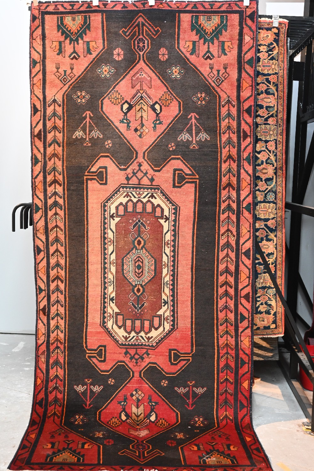 A LARGE 1960s TRIBAL PERSIAN HAMADAN 100% WOOL AND NATURAL DYES, HAND KNOTTED NOMADIC WEAVE WITH A DESIGN OF LARGE ANCHORED MEDALLION IN DEEP RED CONTAINING TRIBAL MOTIFS ON A CHARCOAL FIELD WITH FLORAL TRIBAL MOTIFS. SIZE: 307 X 136 CM ORIGIN: PERSIA