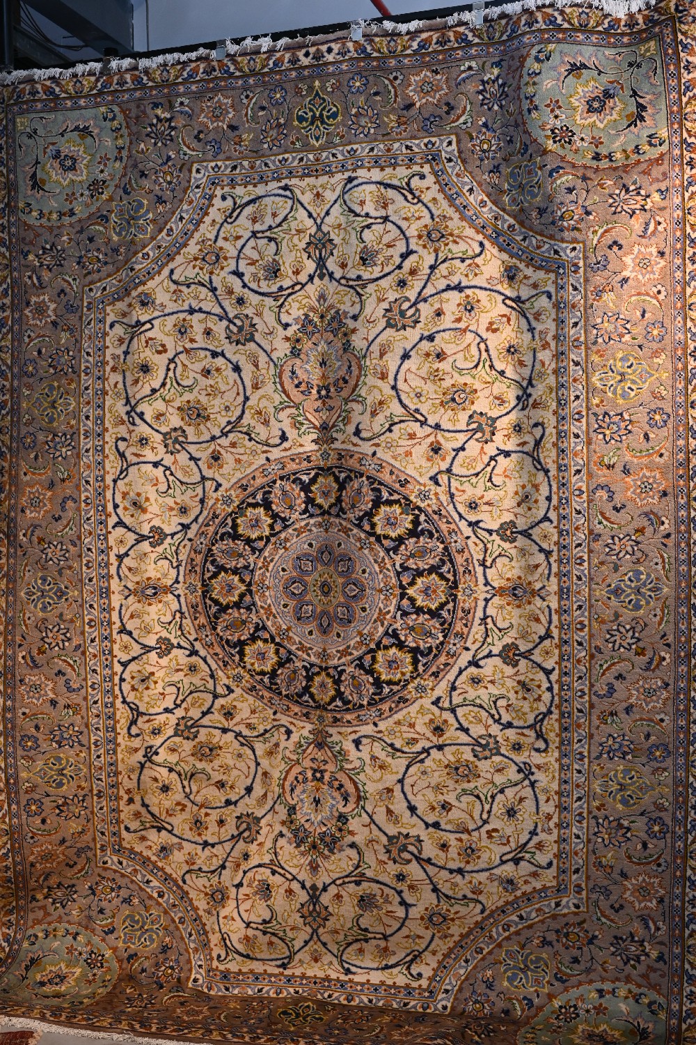 A MAGNIFICENT PERSIAN ISFAHAN CARPET. 100 % FINE, SOLID WOOL PILE. FINELY HAND- KNOTTED ISFAHAN DESIGN OF A CENTRAL BEAUTIFUL ROUND FLORAL ELONGATED MEDALLION WITHIN AN ELEGANTLY SCULPTED FIELD OF ARABESQUE SCROLLS FLORAL MOTIFS, PALMETTES ON A NEUTRAL TONE FIELD. WITH HINTS OF EMERALD, FRENCH BLUE AND GOLD. MAJOR BORDER AND CORNER MEDALIANS OF FLEUR DE LIS, FLORAL SPRAYS, AND PALMETTES ON A MUSHROOM HUE WITHIN A LIGHT TURQUOISE GREEN DOME. SIZE: 363 X 257 CM ORIGIN: PERSIA - RRP: $6,200 CONDITION: EXCELLENT – EX GALLERY DOCUMENTATION OF AUTHENTICITY INCLUDED