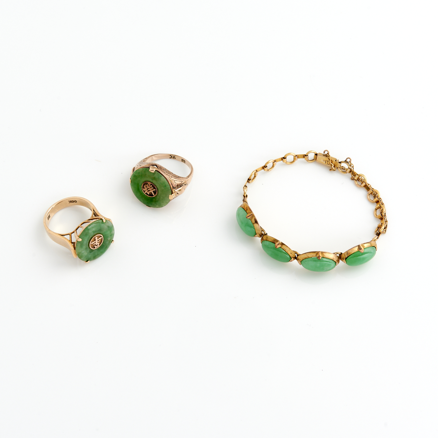 A JADE JEWELLERY SUITE IN 14CT GOLD, INCLUDING A BRACELET AND TWO RINGS, WEIGHT 20GMS, RINGS SIZE K AND L,